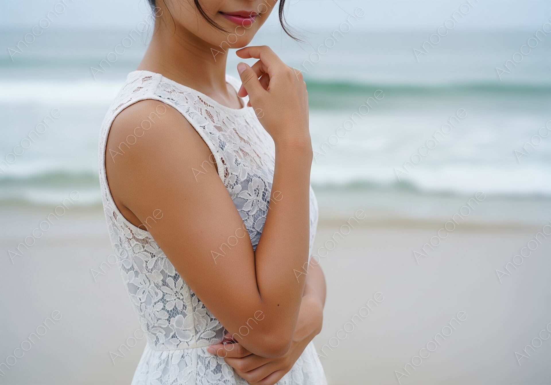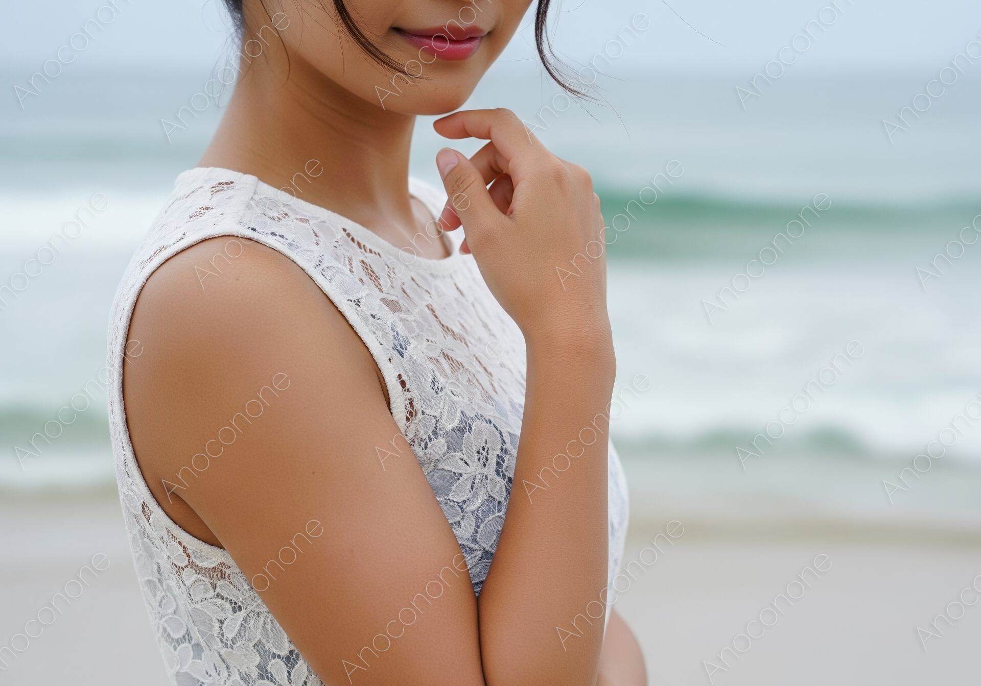 画像素材:少し落ち着いた光が漂う海辺で、繊細な白いレースのノースリーブワンピースを身にまとった女性が佇んでいる様子を捉えた一枚です。背景には穏やかに波打つ海が広がっており、賑やかな真夏のピークを過ぎたような、静かで情緒的なビーチリゾートの雰囲気が漂っています。太陽の名残を感じさせる健康的に日焼けした滑らかな肌の質感が美しく、自分自身と向き合う穏やかな休日をイメージさせる構成となっています。レースの透け感が涼しげで、女性らしい上品さと清潔感を演出しています。指先を顎に添えて遠くを見つめるような仕草は、波音を聞きながら物思いにふける大人の女性の空気感を表現しています。全体的にしっとりとしたナチュラルなトーンでまとめられており、見る人に安らぎと洗練された印象を与えます。夏の終わりのファッション特集や、旅行サイトのイメージ画像、落ち着いたトーンの美容コラムなど、幅広い用途で活用いただけます。