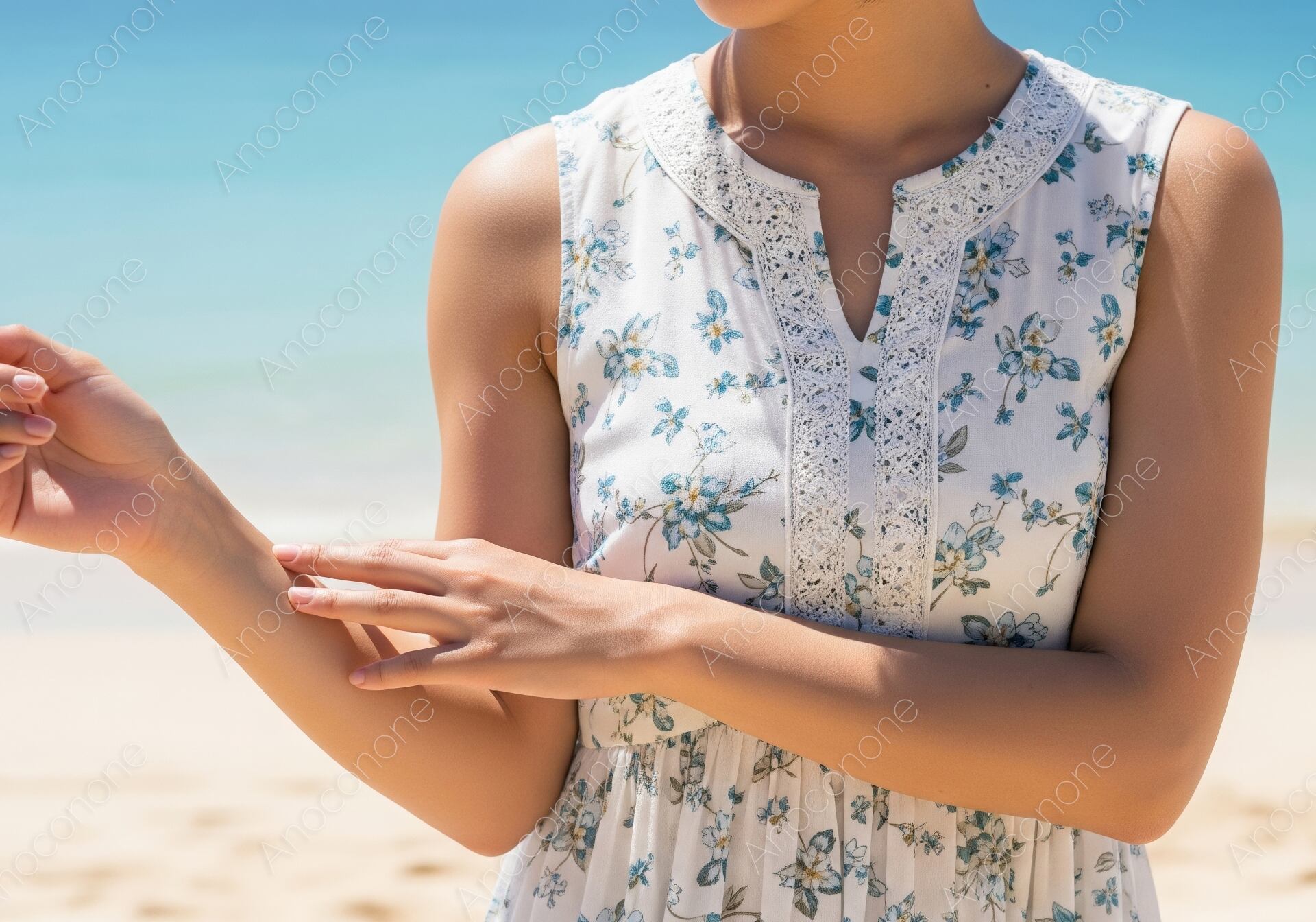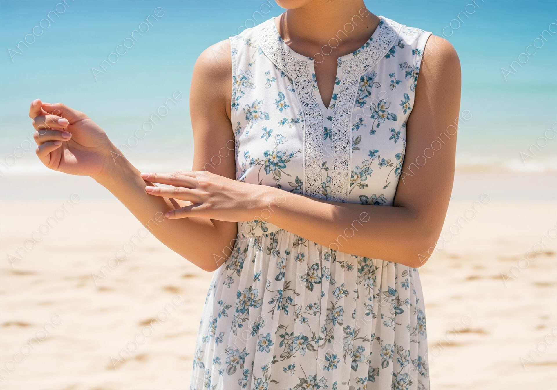 画像素材:眩い太陽の光が降り注ぐ夏の砂浜で、繊細なレースがあしらわれたボタニカル柄のワンピースを身にまとった女性が、自身の日焼けした腕にそっと触れている様子を捉えた一枚です。背景にはどこまでも続く青い海と白い砂浜が広がっており、理想的なビーチリゾートのロケーションが開放感を演出しています。太陽の光をたっぷりと浴びて健康的に輝く肌の質感が美しく、夏のバカンスを心ゆくまで楽しんでいる大人の休日をイメージさせる構成となっています。白地に落ち着いたブルーの模様が入ったワンピースは、清潔感と上品さを兼ね備え、夏の海辺の景色に爽やかに溶け込んでいます。手元の仕草は、日差しによる肌の変化を確かめているような自然な瞬間を切り取っており、見る人にストーリーを感じさせます。夏のレジャー特集や、旅行サイトのアイキャッチ、日焼け後のスキンケアをテーマにした広告など、季節感を重視する様々な媒体に最適です。夏のポジティブなエネルギーを伝えるメインビジュアルとしておすすめします。