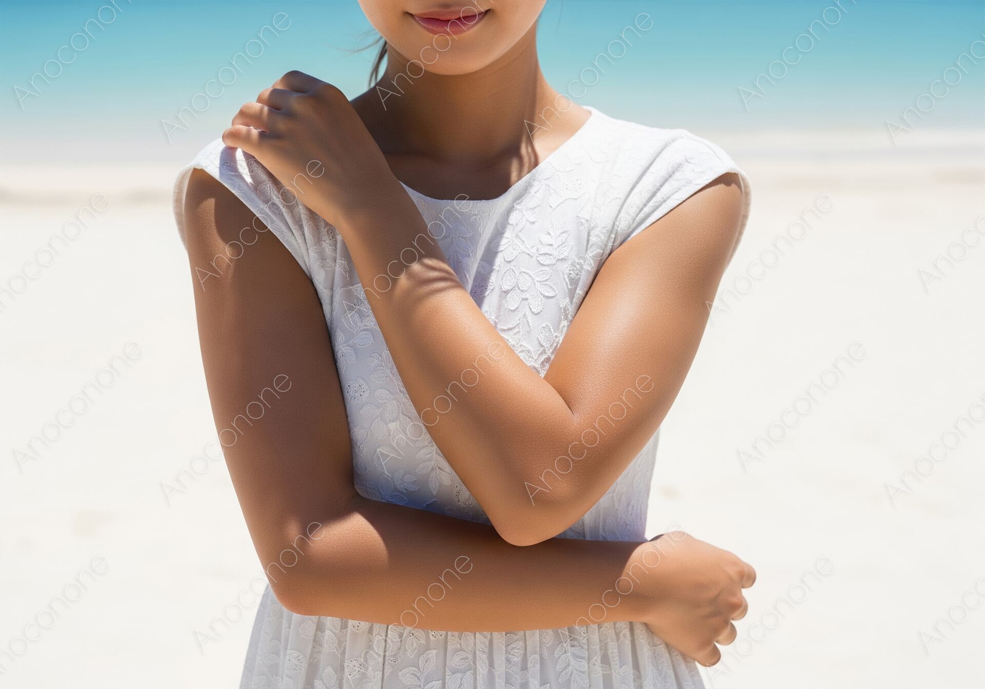 画像素材:見渡す限り真っ白な砂浜と、遠くに広がるエメラルドブルーの海を背景に、清潔感あふれる白いレースのワンピースを身にまとった女性が佇んでいる場面です。太陽の光を全身に浴びて、健康的に日焼けした滑らかな肌の質感が際立っており、コントラストの効いたビジュアルが強い印象を残します。腕をクロスさせて自分の身体を包み込むようなポーズは、夏の強い日差しを肌で感じながらバカンスを心ゆくまで楽しんでいる様子を演出しています。背景の砂浜が明るく飛ばされていることで、被写体の健康的な肌色とワンピースの繊細なレース模様が主役として美しく引き立てられています。真夏のポジティブなエネルギーに満ちあふれたこの一枚は、夏のレジャー特集や、日焼け肌を美しく見せるスキンケア・ボディケア商品の広告、リゾート旅行のプロモーションなど、開放的な夏のイメージを求めるシーンに最適です。見る人に憧れを抱かせるような、高品質なメインビジュアルとしてご活用いただけます。