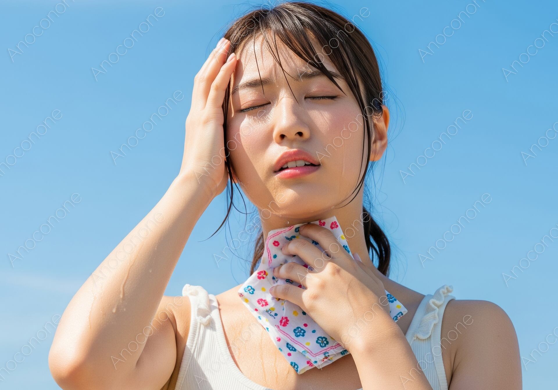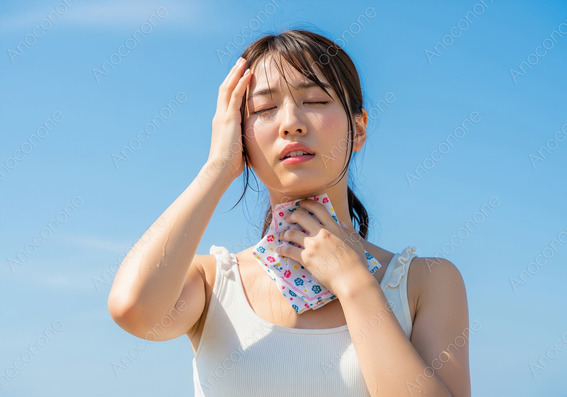 画像素材:抜けるような鮮やかな青空を背景に、白いタンクトップ姿の女性が暑さに耐えながら首元の汗をハンカチで拭っている、夏の一コマを捉えたビジュアルです。目を閉じ、少し火照ったような表情で日差しを浴びる様子は、真夏の厳しい暑さをリアルに伝えます。肌に浮かぶ汗の質感や、日差しに照らされた健康的な肌色が鮮明に描写されており、清潔感を保ちながらも夏のリアリティを感じさせる構成です。背景のシンプルなブルーが被写体の動作をより際立たせ、見る人に季節のエネルギーと対策の必要性を印象付けます。制汗剤や汗拭きシートの広告、熱中症予防を啓発するコンテンツ、夏のスキンケア特集、あるいは「日本の夏」を表現するライフスタイル素材として幅広く活用いただけます。暑さの中でも美しさを忘れない、爽やかな中にも力強さのある高品質な一枚です。