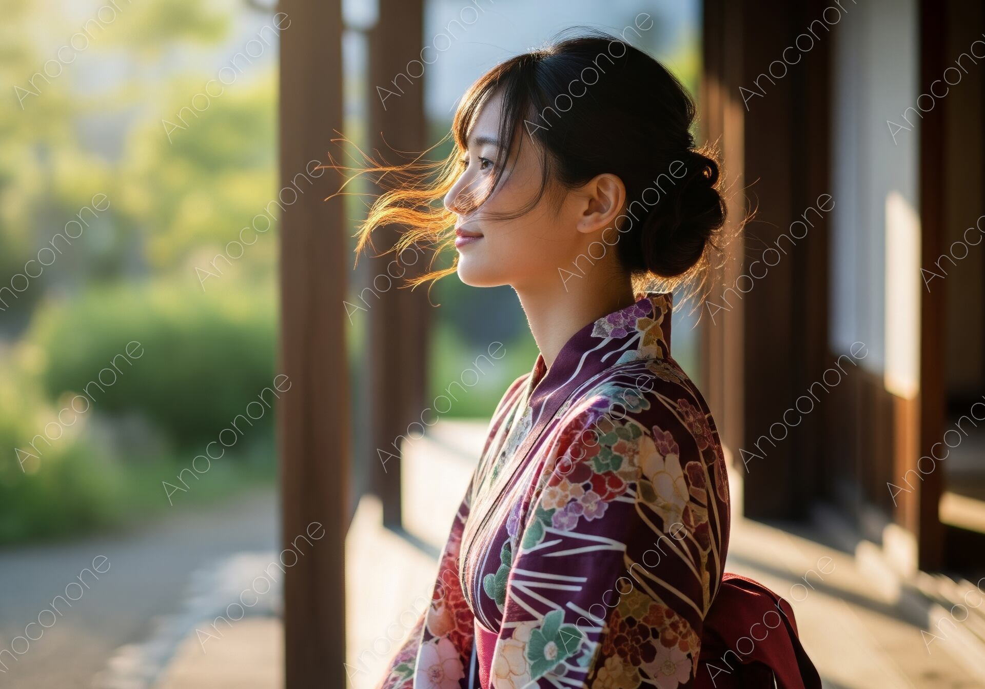 画像素材:黄金色の夕日が優しく差し込む日本の伝統的な縁側で、落ち着いた紫色の浴衣を纏った女性が佇む、情緒あふれる横顔のポートレートです。背景には夕光に照らされた柔らかな庭の緑が広がり、一日の終わりを告げる静かで穏やかな時間が流れています。風にふわりとなびく髪のひと房や、遠くを見つめる凛とした表情が、日常の喧騒から切り離された贅沢な涼を演出しています。浴衣に描かれた色鮮やかな花々の模様が、夕暮れの光の中で美しく浮かび上がり、日本の夏の伝統的な美しさを象徴しています。観光プロモーション、和装関連の広告、季節のイベント告知、あるいは「日本の夏」をテーマにしたエモーショナルなWebコンテンツのメインビジュアルとして最適です。見る人の心に涼風を届けるような、非常に高品質で物語性を感じさせる一枚です。