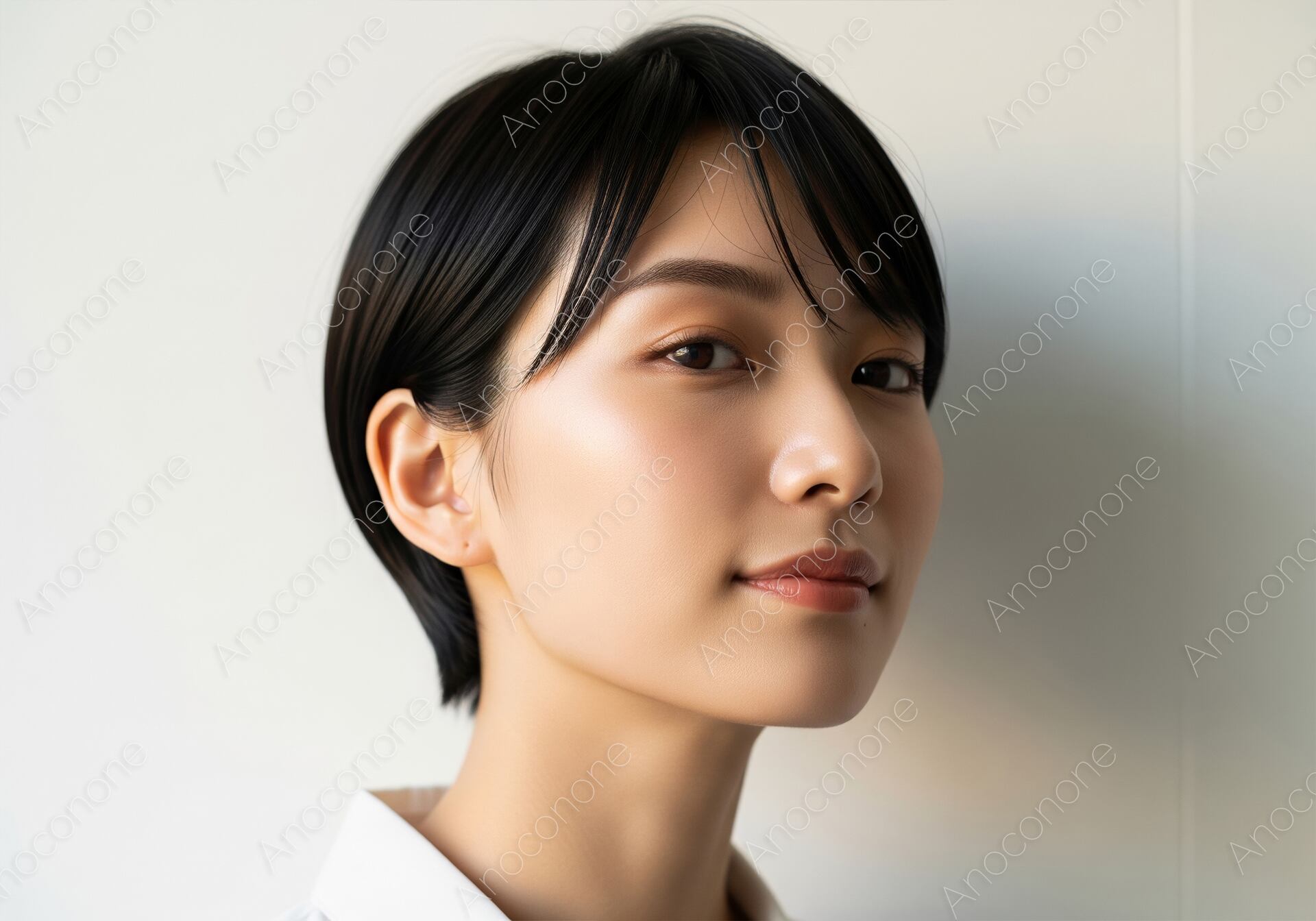 画像素材:洗練された黒髪ショートカットが印象的な、凛とした美しさを持つ女性のポートレートです。柔らかい自然光に照らされた肌は瑞々しく透明感に溢れ、日々の丁寧なスキンケアを感じさせます。わずかに微笑みを浮かべた知的な表情は、見る人に信頼感と爽やかな印象を与えます。白シャツを合わせたミニマルなスタイリングが、被写体のナチュラルな魅力を最大限に引き立てています。ヘアサロンのスタイルカタログ、ビューティー・スキンケア商品の広告、あるいは「自分らしさ」を大切にするライフスタイル提案のアイキャッチなど、多岐にわたるクリエイティブに最適です。清潔感とモダンな感性を両立させた、高品質なビジュアル素材としてご活用いただけます。
