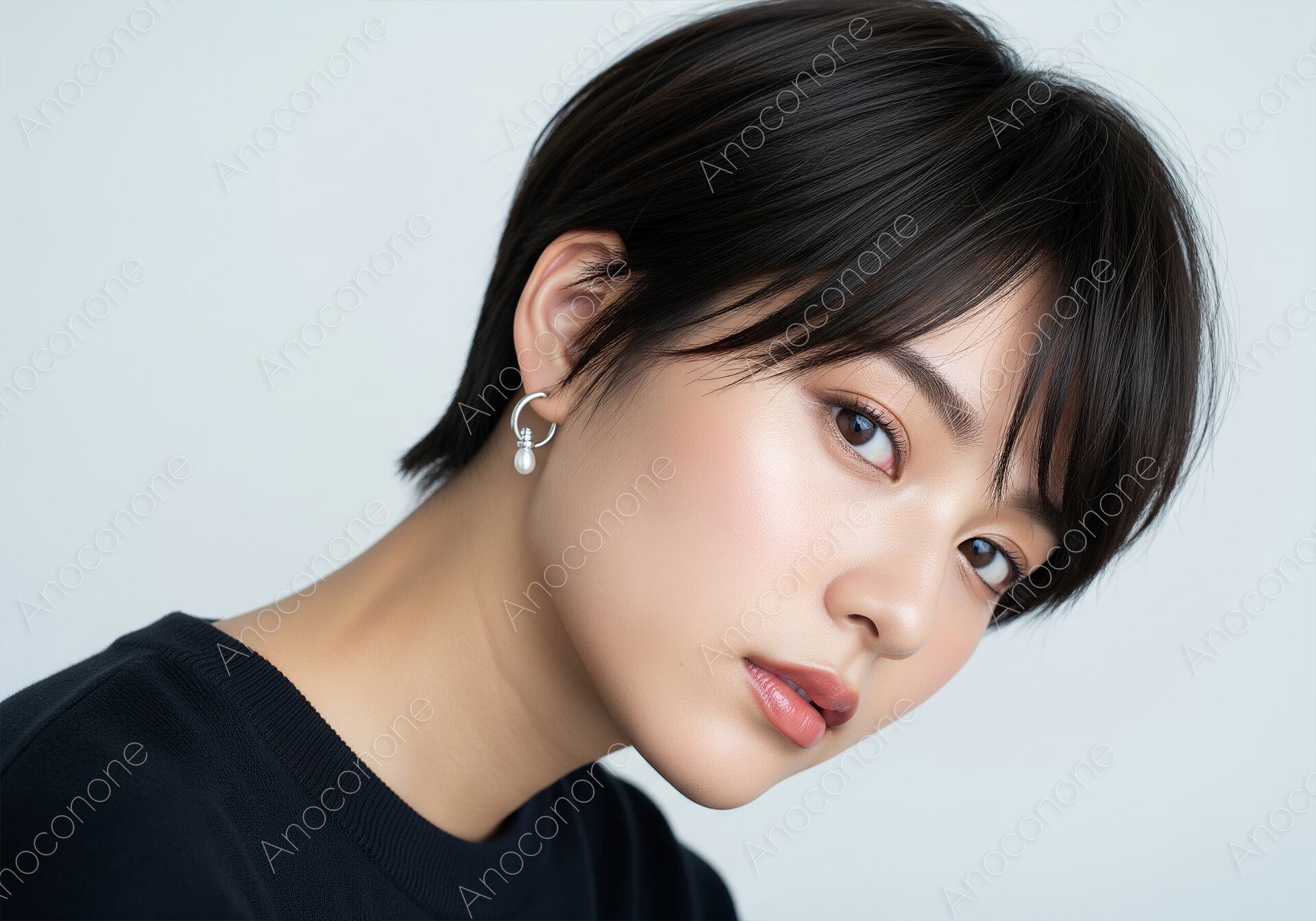 画像素材:都会的で洗練された黒髪のショートヘアスタイルが、顔立ちの美しさを際立たせている女性のポートレートです。透明感のあるきめ細やかな美肌と、アンニュイながらも意志を感じさせる眼差しが、見る人に高い信頼感とエレガントな印象を与えます。耳元で揺れる小ぶりなパールのピアスが、シンプルな黒のトップスに上品な華やぎを添えており、大人の女性の余裕と気品を演出しています。光を巧みに捉えたライティングが、肌の質感や髪の毛一本一本のディテールまで美しく浮かび上がらせており、ヘアサロンのスタイルカタログや、ハイエンドなスキンケア・コスメのプロモーションに最適です。モダンで洗練されたビジュアル、あるいは「自分らしさを確立した女性」をテーマにしたメディアのメインビジュアルとしても幅広くご活用いただけます。