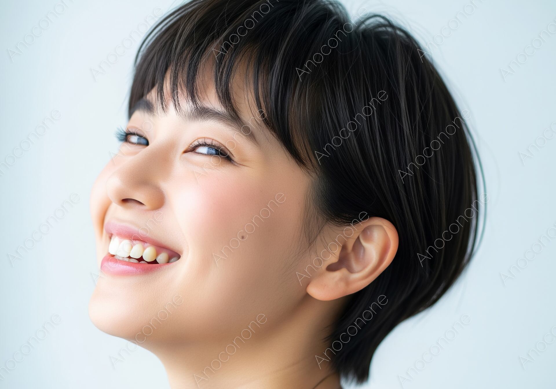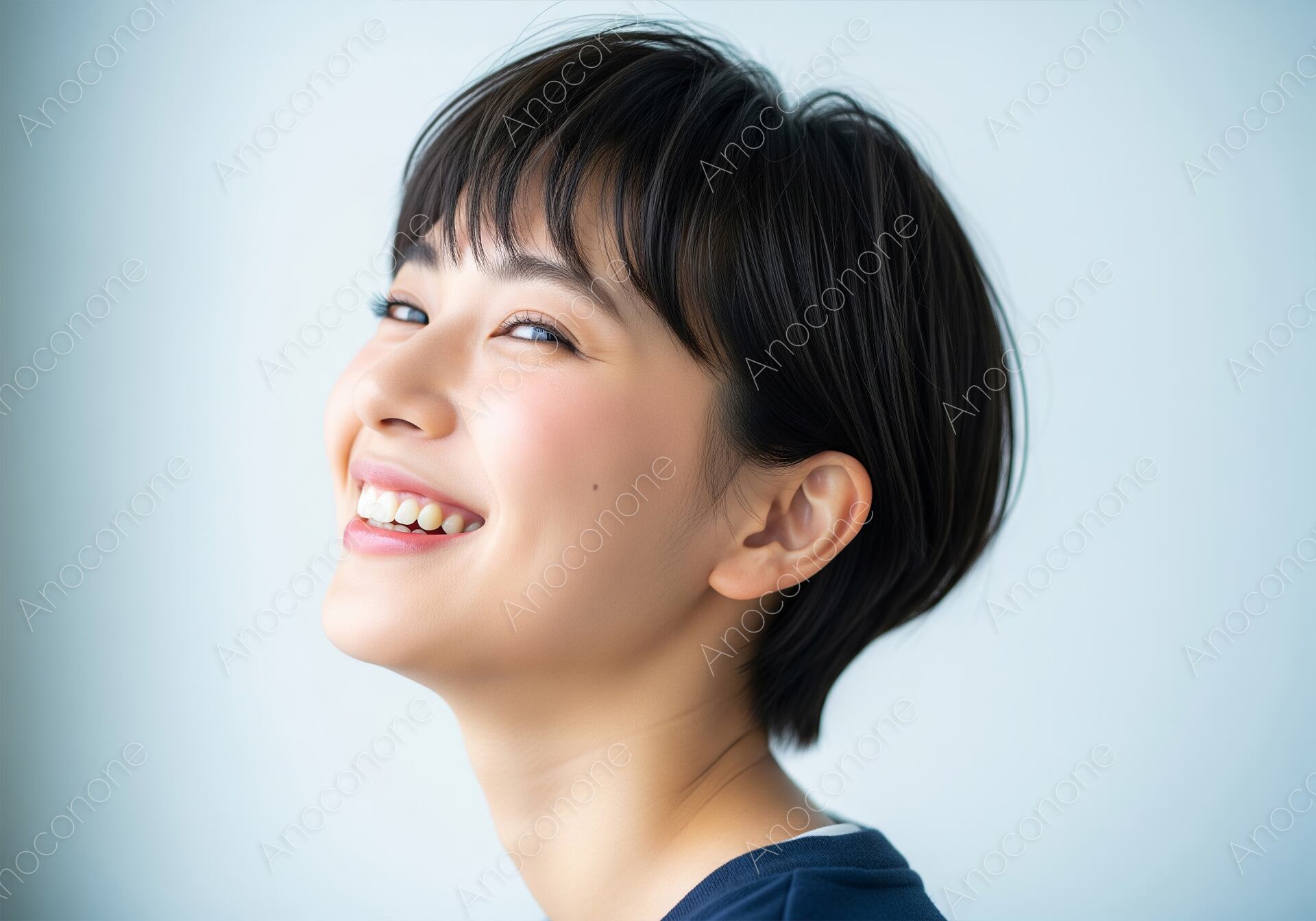 画像素材:明るい光に包まれながら、快活な笑顔を見せるショートヘアの女性を捉えたポートレートです。丸みのあるマッシュベースのカットが、柔らかく親しみやすい雰囲気を演出しています。健康的な白い歯がこぼれる笑顔は非常に晴れやかで、見る人に元気を与えるような明るさがあります。肌の質感は滑らかに整えられており、頬にある小さなほくろが自然なチャームポイントとなっています。背景は淡いブルーグレーのグラデーションになっており、ネイビーのトップスを着た被写体の存在感を際立たせています。全体的に清潔感と透明感にあふれた構成で、美容、健康、歯科、ライフスタイルといった多岐にわたるジャンルの広告やWebコンテンツに適しています。爽やかで誠実なイメージを強調したいビジネスやサービス紹介に最適な一枚です。