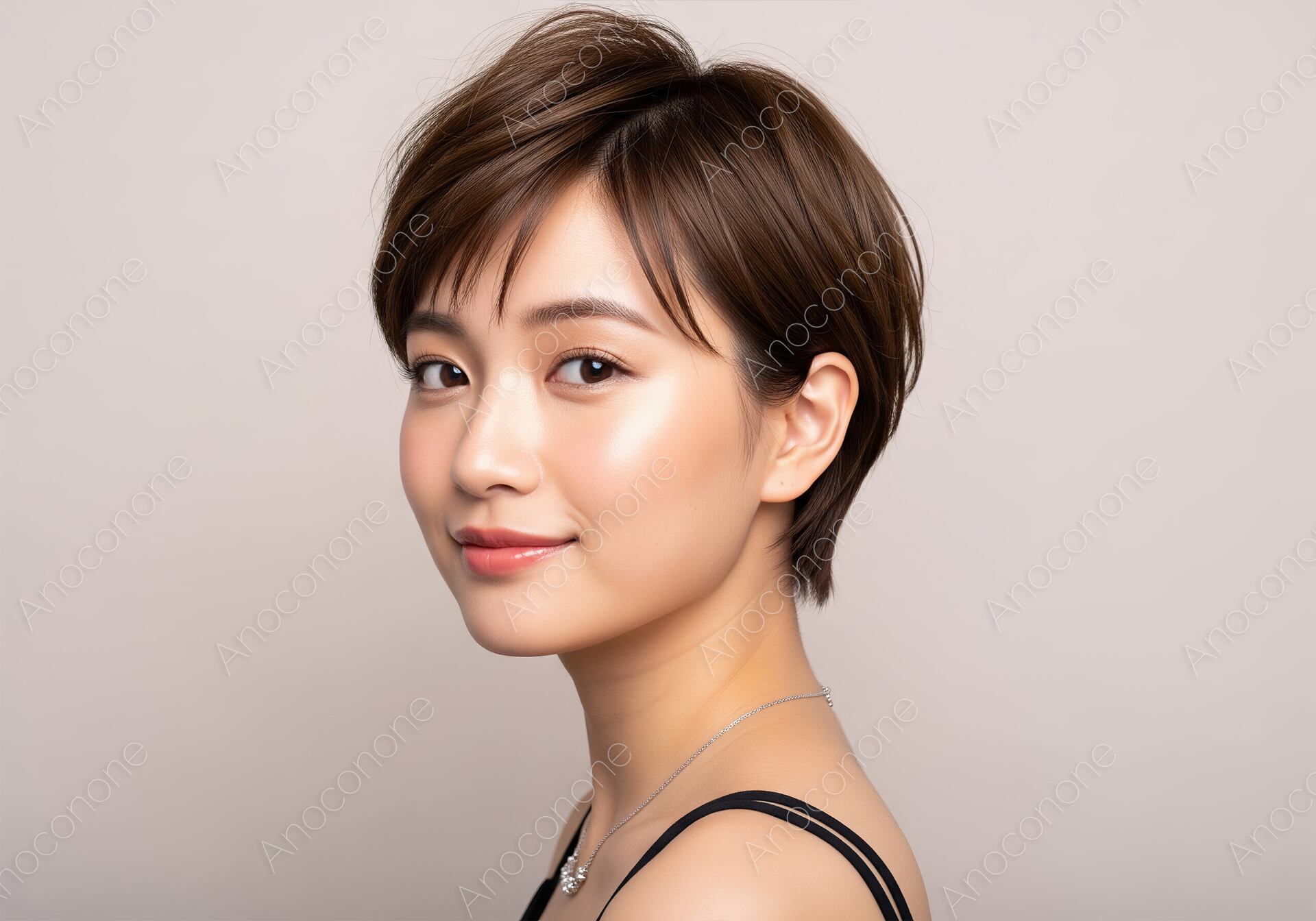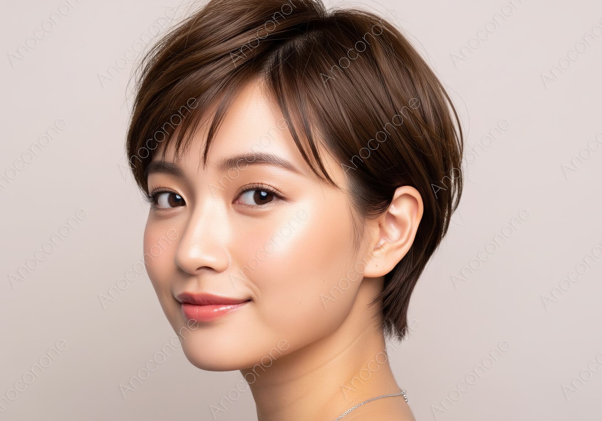 淡い背景の前で、カメラに優しい視線を向けている女性のポートレートです。軽やかで動きのあるショートヘアと、透明感のある肌、そしてデコルテを飾るネックレスが、清潔感と上品さを感じさせます。美容、ファッション、ライフスタイル関連のコンテンツに幅広くお使いいただけます。