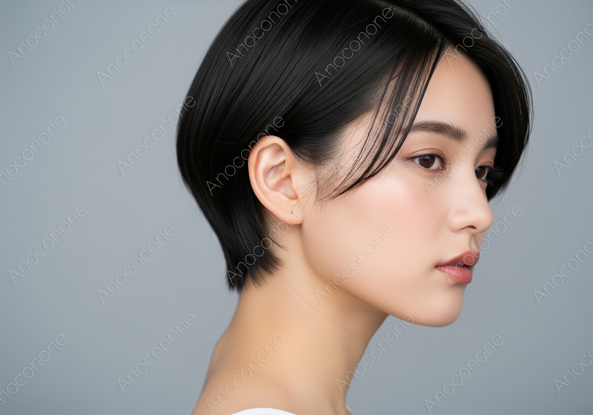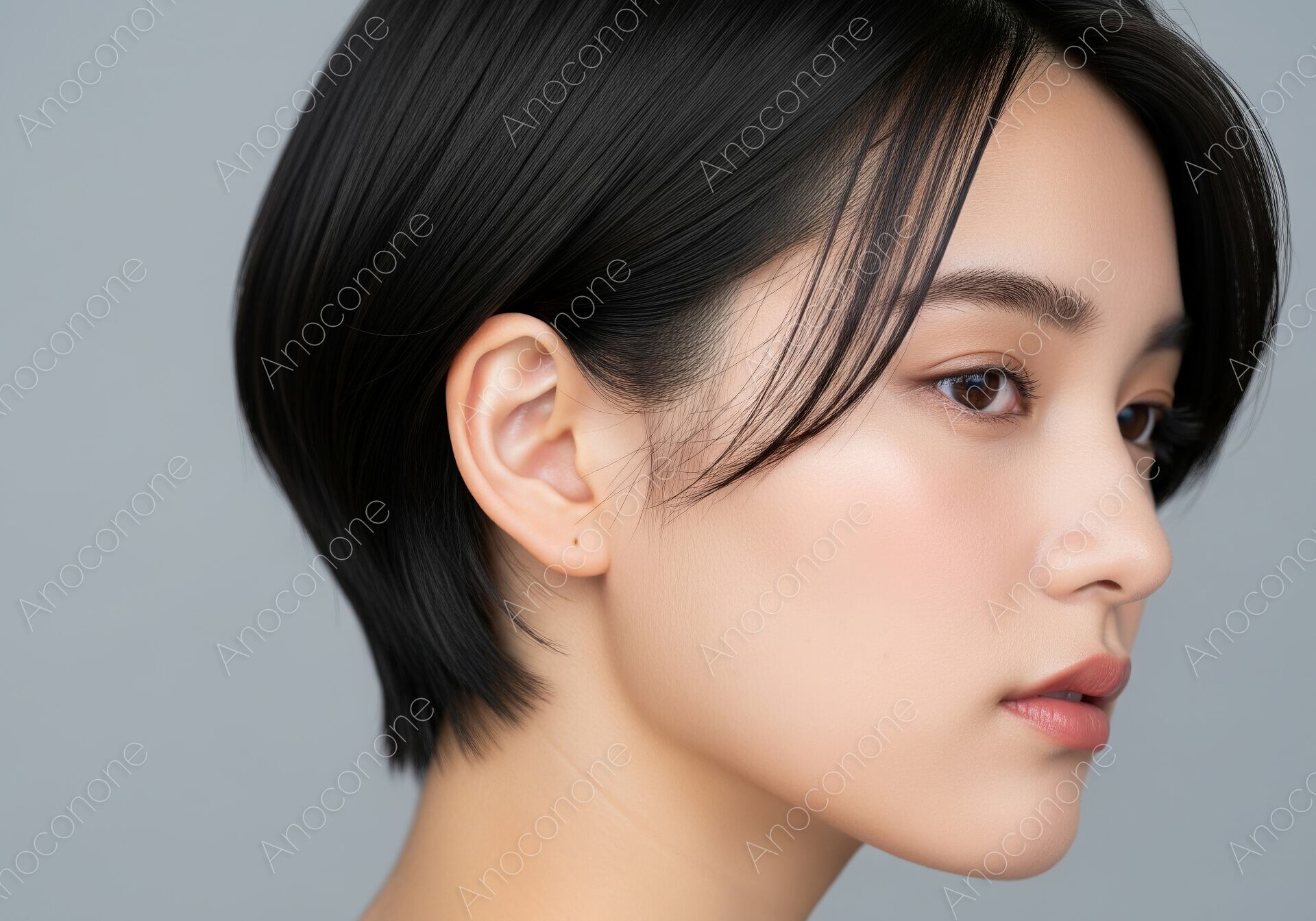 落ち着いたグレーの背景の前で、女性が横顔を見せ、遠くを見つめている画像です。艶やかで美しいショートヘアが、洗練された大人の雰囲気を醸し出しています。清潔感のあるナチュラルなメイクと、どこか物憂げな表情が印象的です。美容、ファッション、ビジネス関連のコンテンツに幅広くお使いいただけます。