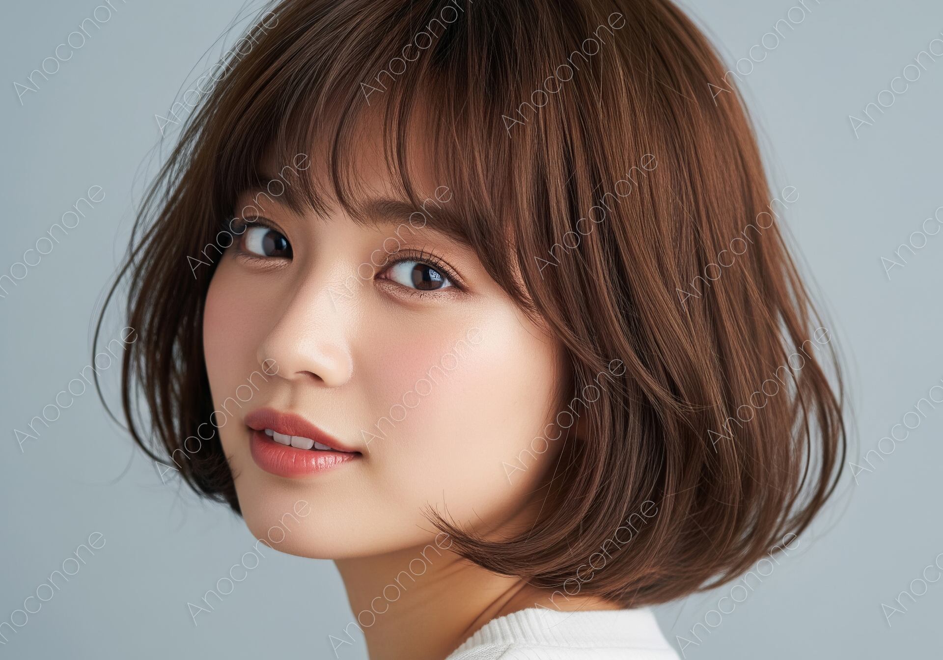 画像素材:柔らかなブラウンカラーのボブスタイルが、優しく親しみやすい印象を与える女性のポートレートです。髪全体に空気を含んだようなふんわりとしたボリュームがあり、顔周りを包み込む曲線が被写体の可愛らしさを引き立てています。きめ細やかな肌の質感や、穏やかな光を宿した瞳、そして自然な血色感のある唇が細部まで緻密に描写されており、清潔感あふれる仕上がりです。肩越しにこちらを振り返るような構図が、見る人に安心感と親近感を与えます。背景は落ち着いたトーンでまとめられており、髪の質感や人物の輪郭を美しく際立たせています。全体的に温かみのあるライティングが施され、被写体が持つ本来の透明感と柔和な表情を自然に表現した一枚です。ヘアサロンのスタイル紹介や、美容関連のバナー、ライフスタイル誌のデザインに活用いただけます。