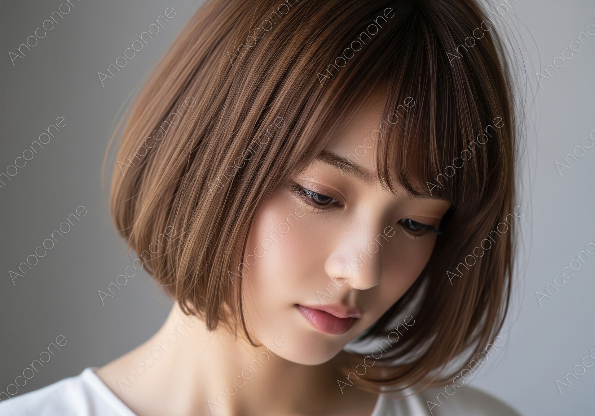 画像素材:明るいブラウンのボブヘアが印象的な、伏せ目がちに佇む女性のポートレートです。髪の表面を流れる繊細な毛流れや、顔周りを優しく包み込む丸みのあるシルエットが、被写体の柔和で落ち着いた美しさを引き立てています。きめ細やかで透明感のある肌の質感や、しなやかなまつ毛、そして自然な血色感のある唇が細部まで緻密に描写されており、洗練された大人の雰囲気が漂います。光が上部から柔らかく降り注ぐことで、髪の質感を立体的に表現し、全体的に温かみのある穏やかな空気感を演出しています。背景をシンプルにぼかした構成により、被写体の存在感と思慮深い表情がより一層際立つ一枚です。清潔感のあるトーンでまとめられており、見る人に安心感と信頼感を与えます。ヘアサロンのスタイル紹介や、美容関連のバナー、ライフスタイルを提案する広告素材に活用いただけます。