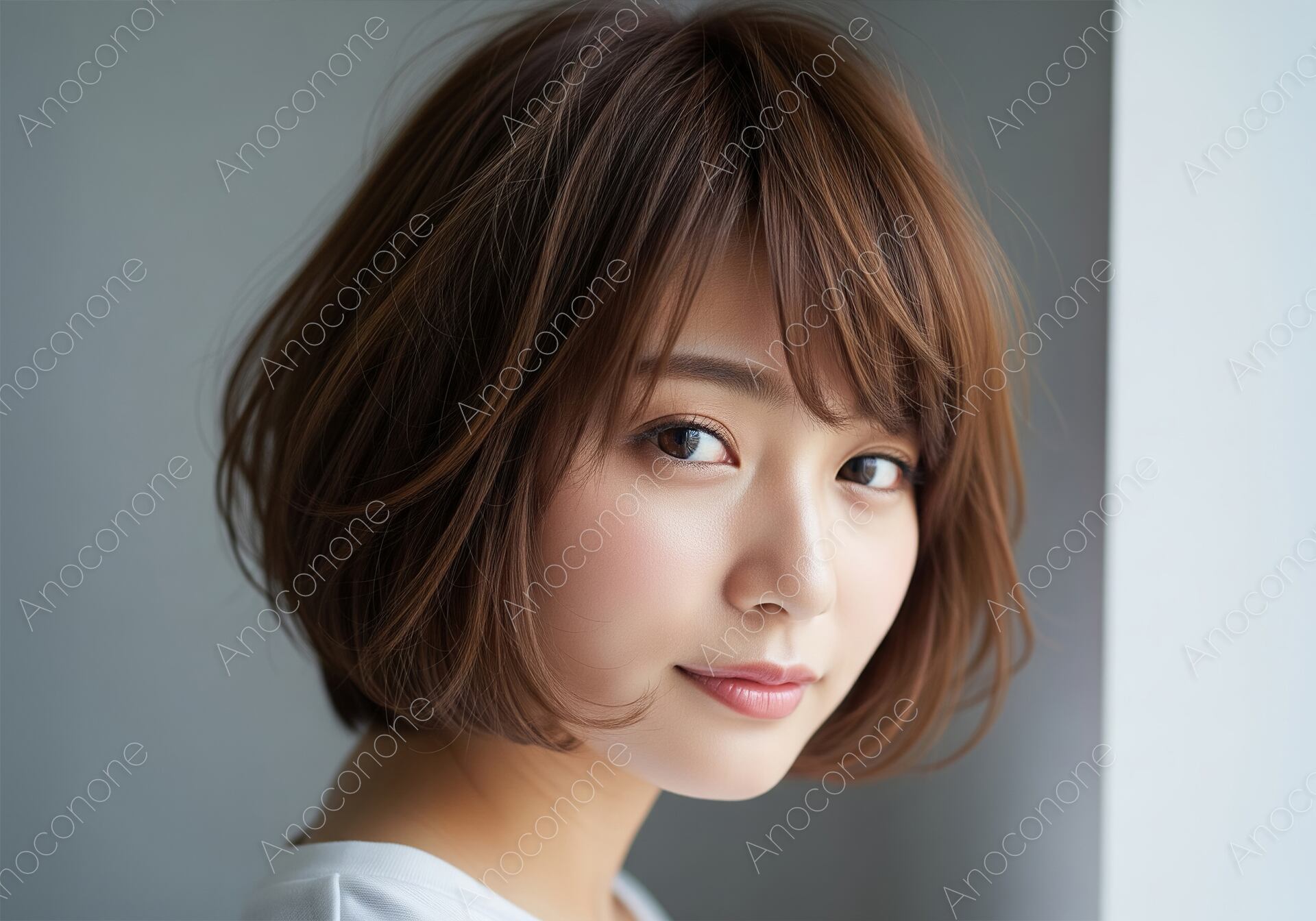 明るいグレーの背景の前で、カメラに優しい微笑みを向ける女性のポートレートです。ふんわりとしたブラウンのボブヘアと、明るい表情が、親しみやすく柔らかな印象を与えます。美容、ファッション、ライフスタイル関連のコンテンツに幅広くお使いいただけます。