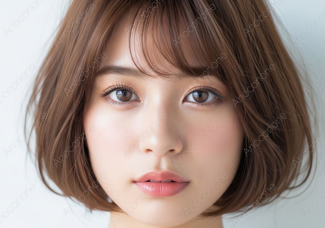 明るい背景の前で、カメラをまっすぐ見つめる女性のポートレートです。ふんわりとしたブラウンのボブヘアと、ナチュラルなメイクが、柔らかな印象を与えます。美容、ファッション、ライフスタイル関連のコンテンツに幅広くお使いいただけます。