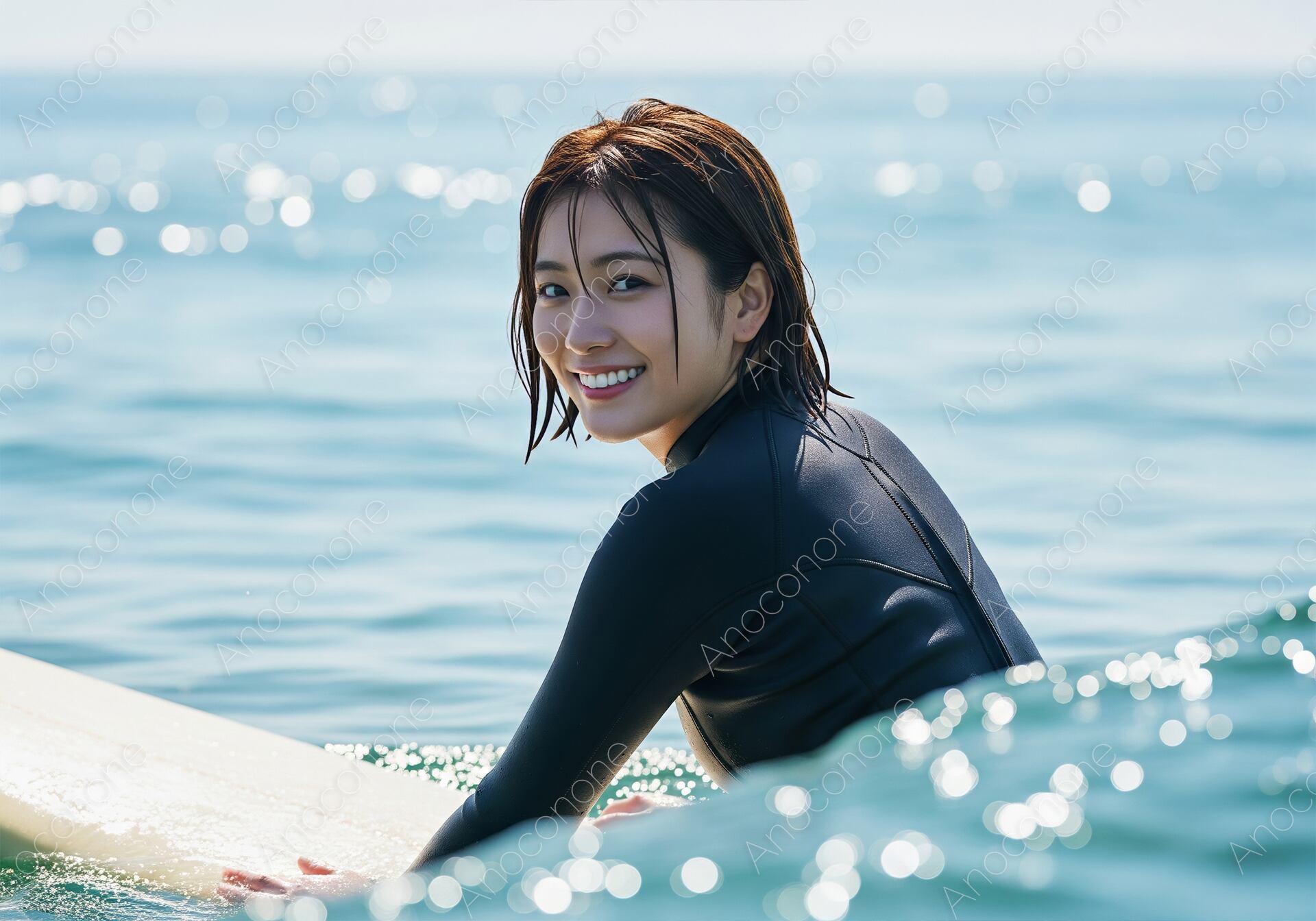 画像素材:青く澄んだ海の上で、ボードに跨りながら弾けるような笑顔を見せる女性のポートレートです。水に濡れて束感の出た髪や、ウェットスーツ越しに伝わる引き締まったシルエットが、アクティブで健康的な美しさを象徴しています。きめ細やかな肌に反射する柔らかな光や、喜びにあふれた瞳の輝き、そして白く整った歯並びが非常に精細に描写されており、見る人にポジティブなエネルギーを与えます。背景の海面は陽光を浴びてキラキラと輝き、美しいボケ味を伴って被写体をよりドラマチックに引き立てています。自然体でありながらも凛とした強さを感じさせるその表情は、スポーツの楽しさや充実感を完璧に捉えています。サーフィン関連のプロモーションや、夏をテーマにした広告、健康的なライフスタイルを提案するWebサイトのメインビジュアルとして最適です。
