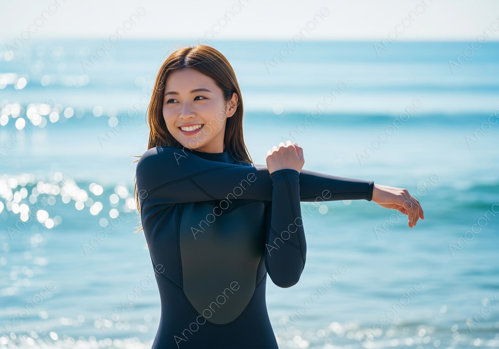 画像素材:陽光が降り注ぐ美しいビーチを背景に、サーフィン前のストレッチを行う女性を捉えたポートレートです。身体に心地よくフィットしたウェットスーツを纏い、腕を伸ばして準備運動をする姿からは、スポーツを楽しむ前のはつらつとしたエネルギーが伝わってきます。きめ細やかで健康的な肌の質感や、風にそよぐさらりとした長い髪、そしてこれから始まる波乗りへの期待に満ちた晴れやかな笑顔が非常に精細に描写されています。背景には、陽光を反射してキラキラと輝く波打ち際が広がり、爽やかなボケ味が被写体の存在感をいっそう際立たせています。自然の中でアクティブに活動する女性の強さと美しさを完璧に表現した一枚です。フィットネスやマリンスポーツのプロモーション、健康的なライフスタイルを提案する広告、夏をテーマにしたSNSコンテンツのメインビジュアルとして最適です。