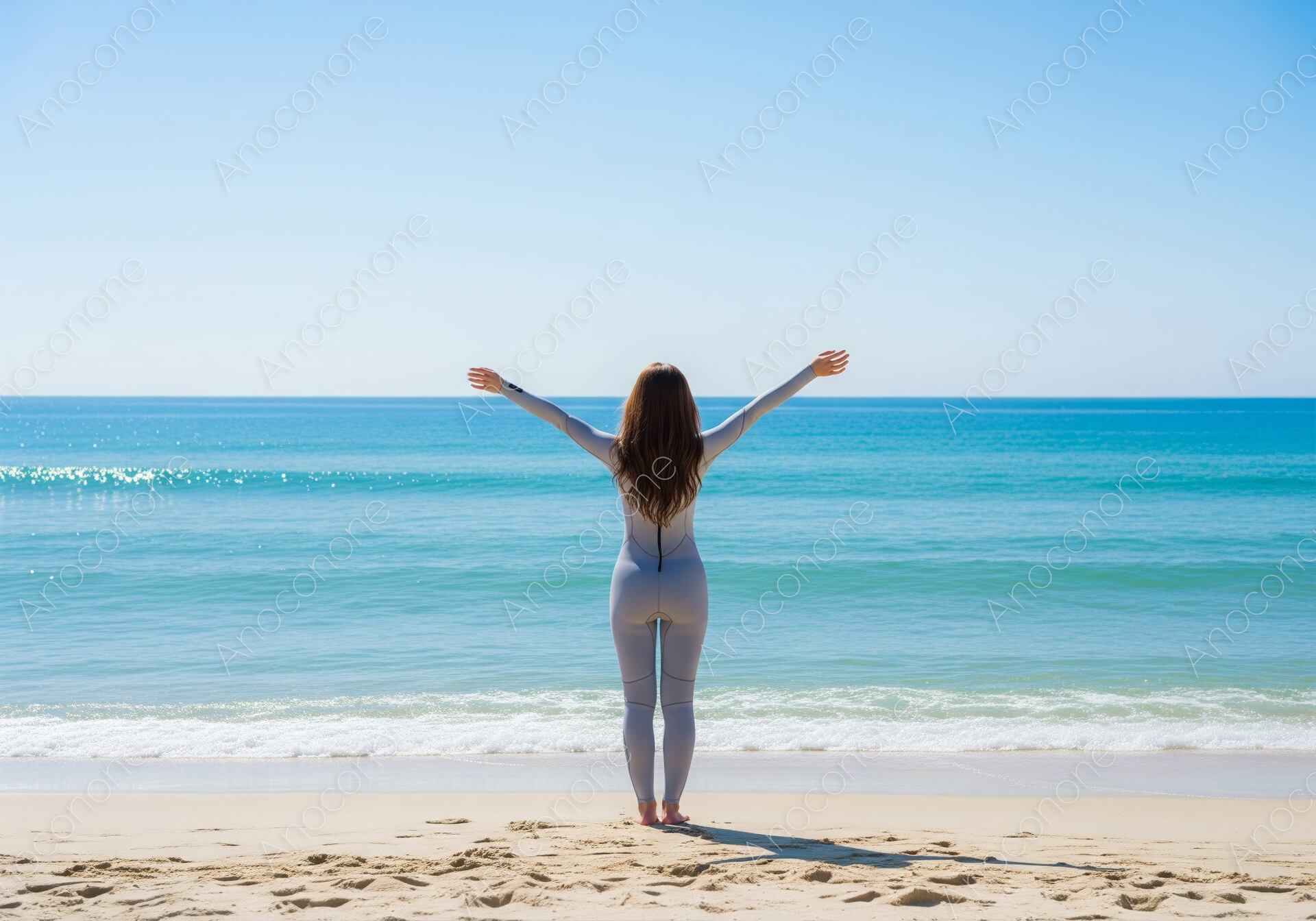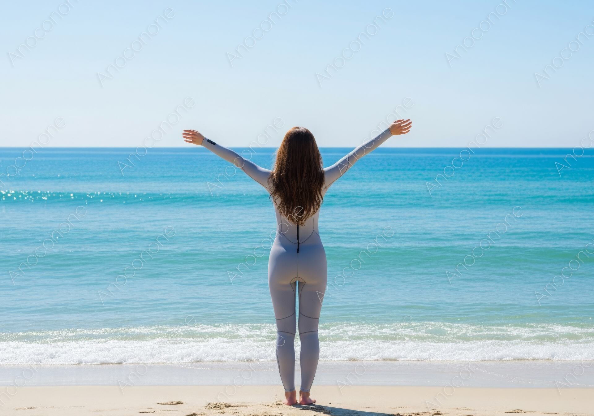画像素材:どこまでも続く水平線と澄み渡る青空に向かって、砂浜で大きく両手を広げる女性の後ろ姿を捉えた、開放感あふれるショットです。身体のラインに美しくフィットしたグレーのウェットスーツを纏い、潮風に揺れる柔らかなロングヘアが、自然と一体になる心地よさを象徴しています。波打ち際の白い泡立ちや、陽光を反射してエメラルドグリーンに輝く海面、そして足元に広がるきめ細やかな砂の質感が非常に精細に描写されており、まるでその場にいるかのような臨場感を与えます。画面中央に被写体を配置したシンメトリーに近い構成は、見る人に安定感と自由への憧れを抱かせます。マリンスポーツの魅力だけでなく、旅のデスティネーション紹介や、心身のリフレッシュ、マインドフルネスをテーマにした広告素材として最適です。夏、海、自由、そして自己解放を表現するメインビジュアルに活用いただけます。