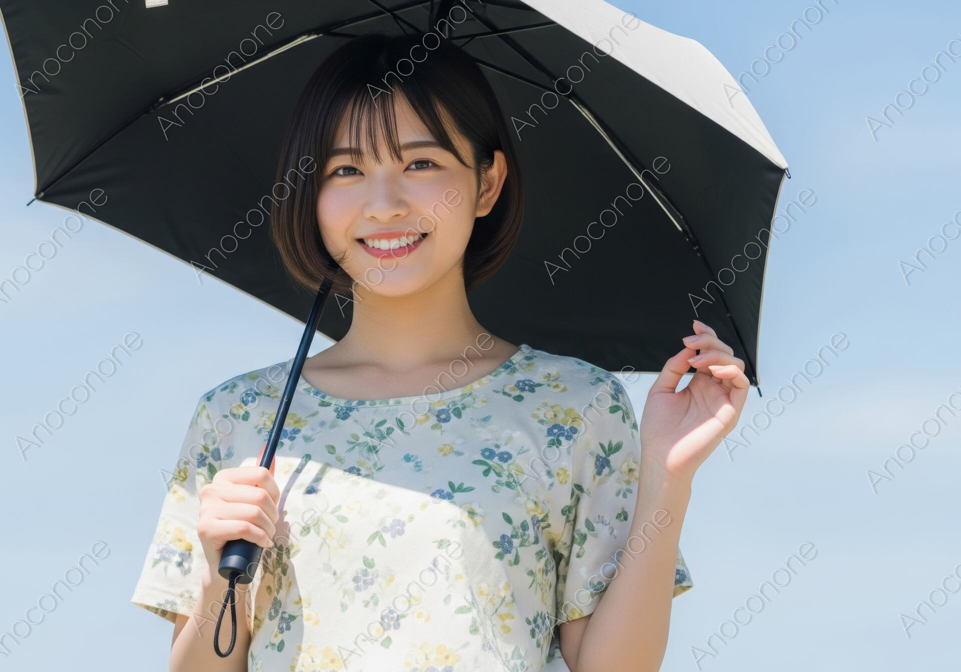 画像素材:淡く霞むような夏の青空を背景に、内側が黒の日傘を差して歩く女性を捉えたポートレートです。淡い花柄のトップスを纏い、カメラに向かって屈託のない笑顔を見せる姿は、真夏の暑さの中でも涼やかでポジティブな印象を与えます。風にふわりとなびくショートボブの黒髪や、日傘の影によって生まれる柔らかな陰影、そして透明感あふれる肌の質感が非常に精細に描写されています。日傘の深い色味と、優しく広がる空の明るいトーンのコントラストが、被写体の清潔感と快活な魅力をいっそう引き立てています。画面全体に漂う清々しい空気感は、見る人に快適な夏の日常をイメージさせる構成です。UVケア用品のプロモーション、夏のお出かけをテーマにしたコラム、幅広い年代に向けたライフスタイル広告のメインビジュアルとして最適です。