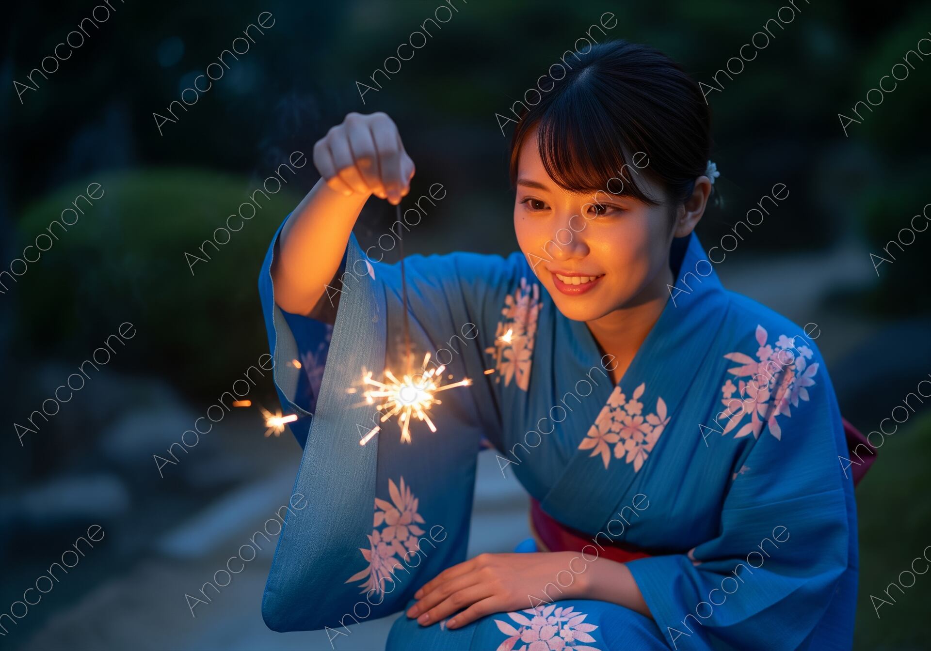 夏の夜の静かな庭で、美しい浴衣姿の女性が手持ち花火を楽しみながら、その輝きを優しく見つめています。花火の光が彼女の表情を温かく照らし、夏の夜の穏やかで幻想的な雰囲気を醸し出しています。日本の夏の風物詩、イベント、旅行、ノスタルジーといったテーマの広告やコンテンツに、心に残るイメージを提供します。