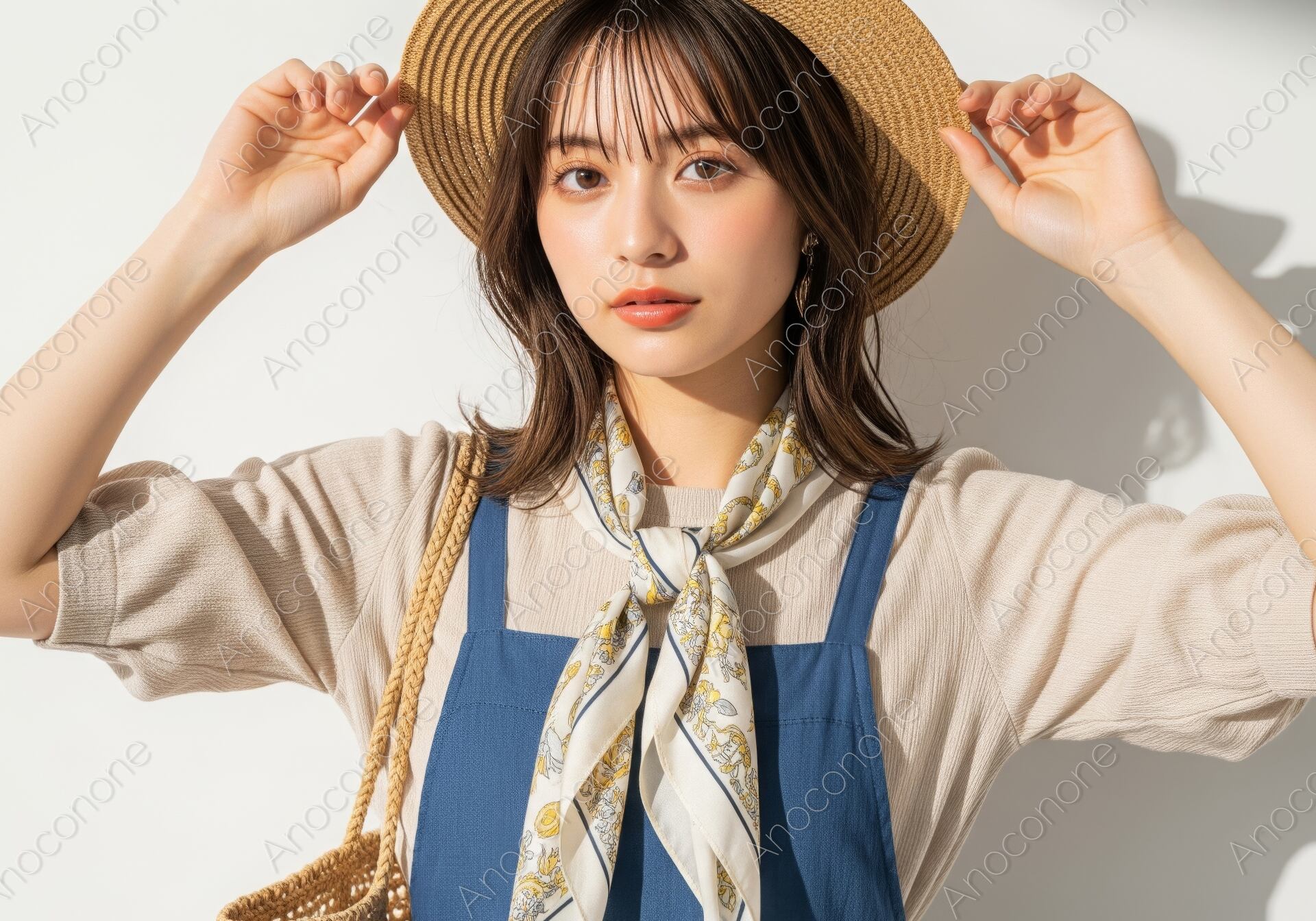 画像素材:明るい自然光が差し込む白い壁を背景に、夏の装いを見せる女性を捉えたファッションポートレートです。麦わら帽子にブルーのサロペット、そして首元に巻いた繊細な柄のスカーフが、カジュアルさの中に洗練された上品さを演出しています。女性の意志を感じさせる美しい眼差しや、滑らかな肌の質感、編み込みのバッグの細かなディテールまで非常に精細に描写されています。光と影のコントラストが画面に立体感を与え、都会的でありながら涼しげな空気感を醸し出しています。夏の新作ファッションのプロモーション、ライフスタイルマガジンの表紙や特集記事、アパレルECサイトのメインビジュアルとして、ターゲット層の目を引く高品質な一枚です。