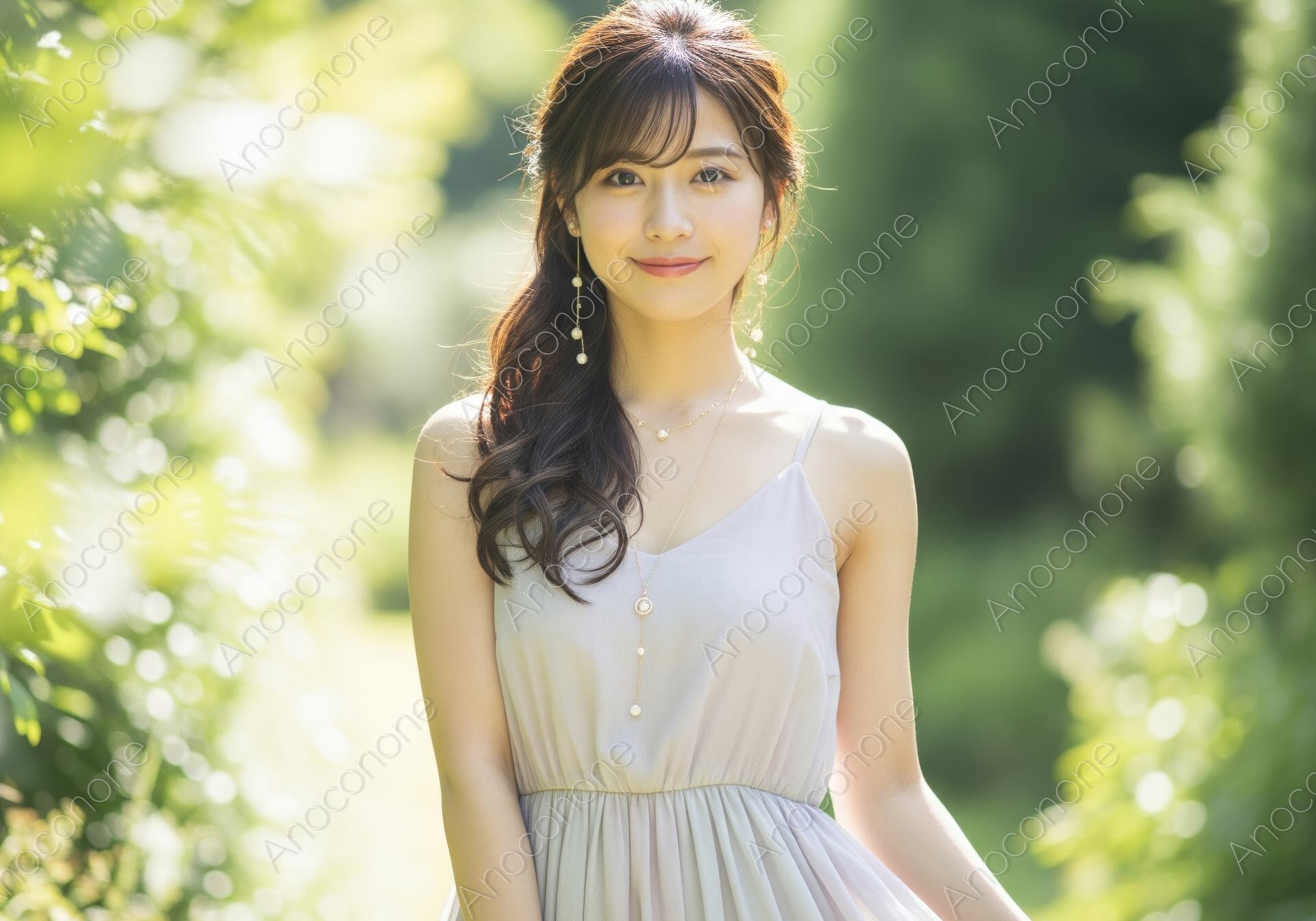 画像素材:豊かな緑に囲まれ、美しい木漏れ日が差し込む庭園で佇む女性を捉えたポートレートです。淡いラベンダーグレーのシフォンワンピースを纏い、カメラに向かって優しく微笑む姿は、夏の昼下がりの穏やかさと気品を感じさせます。風にふわりとなびくウェーブヘアや、耳元で揺れる繊細なアクセサリー、そして逆光によって輝く肌の質感が非常に精細に描写されています。背景の鮮やかな緑が美しくボケることで、被写体の透明感がいっそう際立ち、幻想的で物語性のある一枚に仕上がっています。夏の新作ファッションのプロモーション、ビューティー・スキンケア広告、婚活・マッチングサービスのイメージビジュアル、またはリゾート観光のパンフレットなど、上品さと清潔感を重視するコンテンツに最適です。