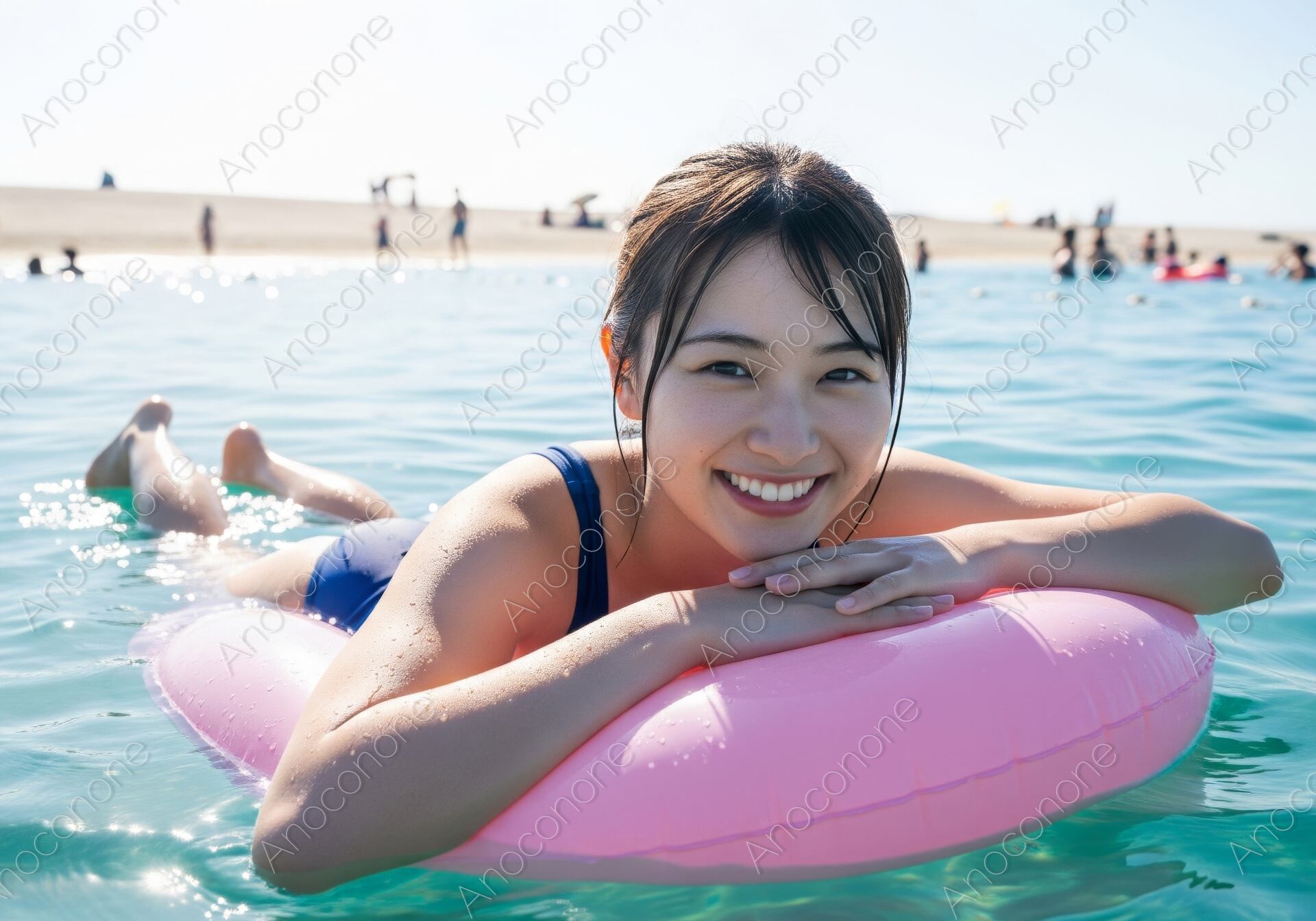 画像素材:陽光が降り注ぐ広大な海の上で、ピンク色の浮き輪に顎を乗せてゆったりと浮かぶ女性の姿を捉えた一枚です。透明度の高い海水からは、水面下の様子まで見通せるほどクリアな質感が伝わり、背景には賑わいを見せる白い砂浜が広がっています。女性は紺色の水着を身にまとい、自然体で柔らかな笑顔を見せており、夏の休日を満喫している穏やかな空気が漂います。キラキラと輝く水面の反射と、突き抜けるような青空のコントラストが、開放感あふれるビーチの情景を鮮明に描き出しています。被写体の肌に付いた水滴や髪の質感も細かく表現されており、夏の暑さと水の冷たさが同居する独特の臨場感があります。構図のバランスが良く、リゾート地のプロモーションや夏のレジャーをテーマにした広告素材として活用できる画像です。