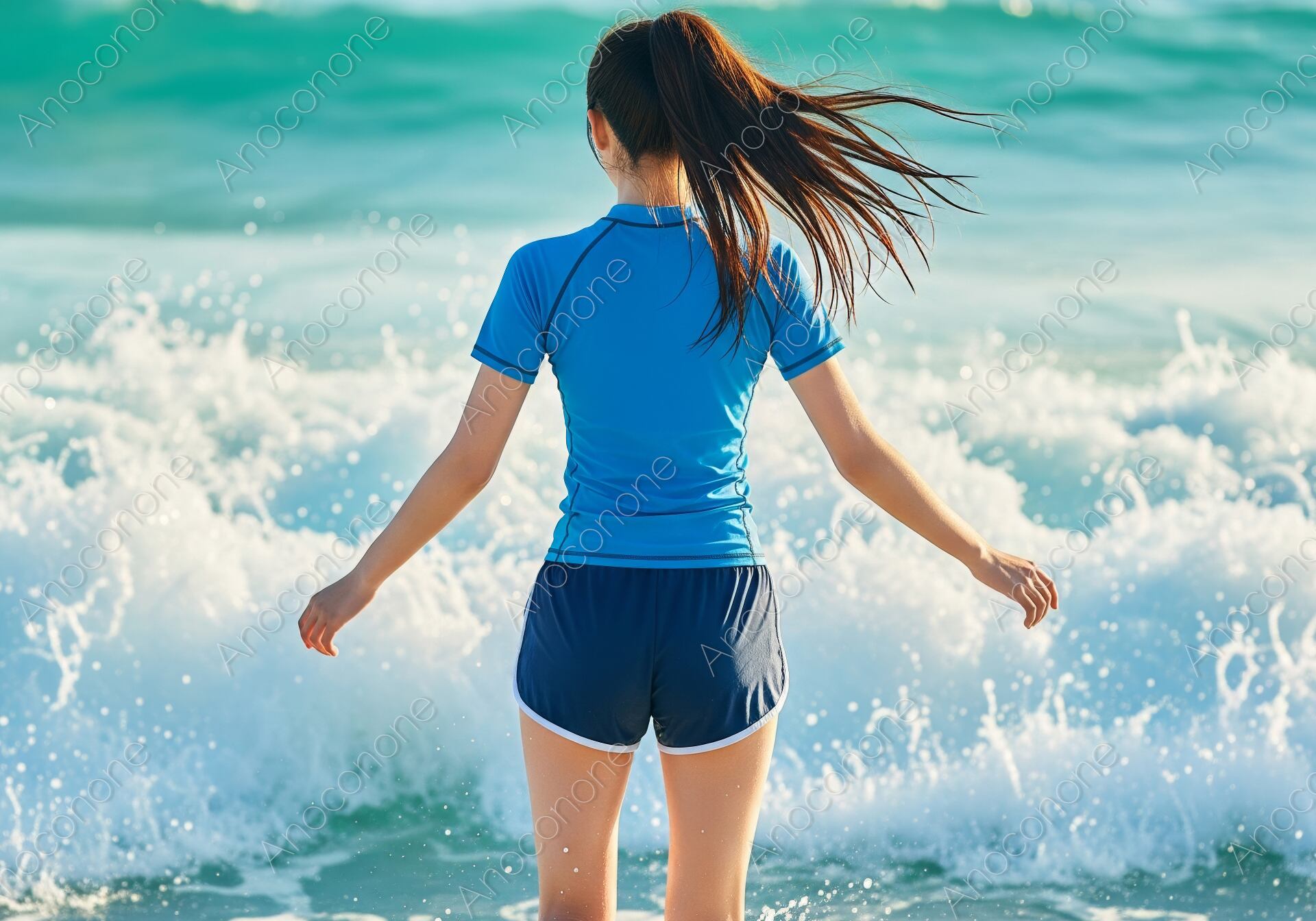 画像素材:鮮やかな青色のラッシュガードと紺色のショートパンツを着用し、波しぶきが上がる海辺で遊ぶ女性を背後から捉えた一枚です。風になびくポニーテールの髪が躍動感を演出し、目の前に広がるエメラルドグリーンの海と白い波の対比が清々しい夏の空気感を描き出しています。足元には透明な海水が広がり、勢いよく押し寄せる波の質感がリアルに表現されており、見ているだけで水の冷たさや潮風の香りが伝わってくるようです。太陽の光を浴びて輝く水面と、開放的なビーチの情景が調和し、アクティブで健康的な休暇のひとときを象徴しています。構図は被写体を中央に配置し、左右に広がる水平線が奥行きを感じさせる仕上がりです。夏のマリンレジャーやスポーツ用品の広告、旅行関連のビジュアルとして使いやすい画像です。