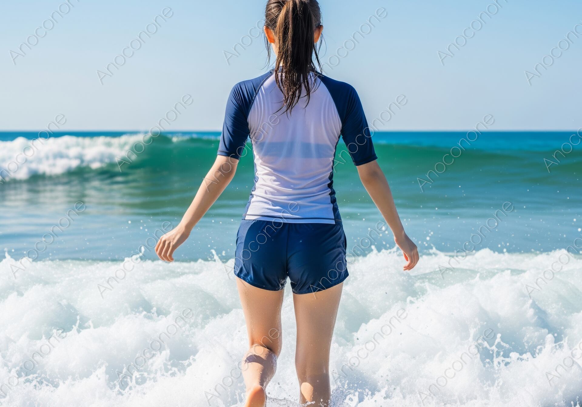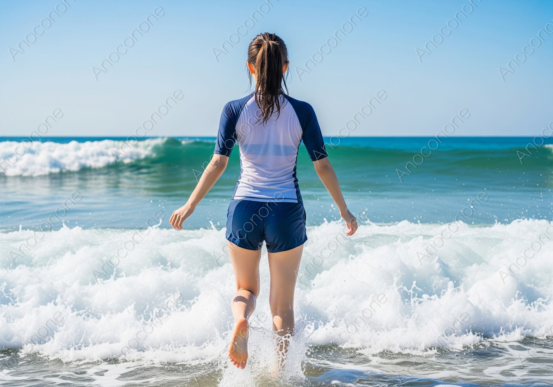 画像素材:白と紺色のスポーティーなラッシュガードを着用し、目の前に広がる大海原へ向かって軽やかに駆け出す女性の後ろ姿を捉えた一枚です。雲一つない快晴の空の下、幾重にも重なり合う真っ白な泡波が砂浜に打ち寄せ、開放感あふれる夏の情景を描き出しています。女性のポニーテールが動きに合わせて揺れ、海水の冷たさを楽しむようなアクティブな躍動感が画面全体から伝わります。太陽の光を浴びて輝く水面と、遠くまで続く水平線のコントラストが美しく、清々しい空気感に満ちています。水しぶきのひとしずくまで鮮明に描写されており、夏のレジャーの楽しさをそのまま切り取ったような臨場感があります。構図は奥行きを活かした配置で、ビーチリゾートのプロモーションや旅行広告、健康的なライフスタイルを提案するビジュアル素材としてお使いいただけます。