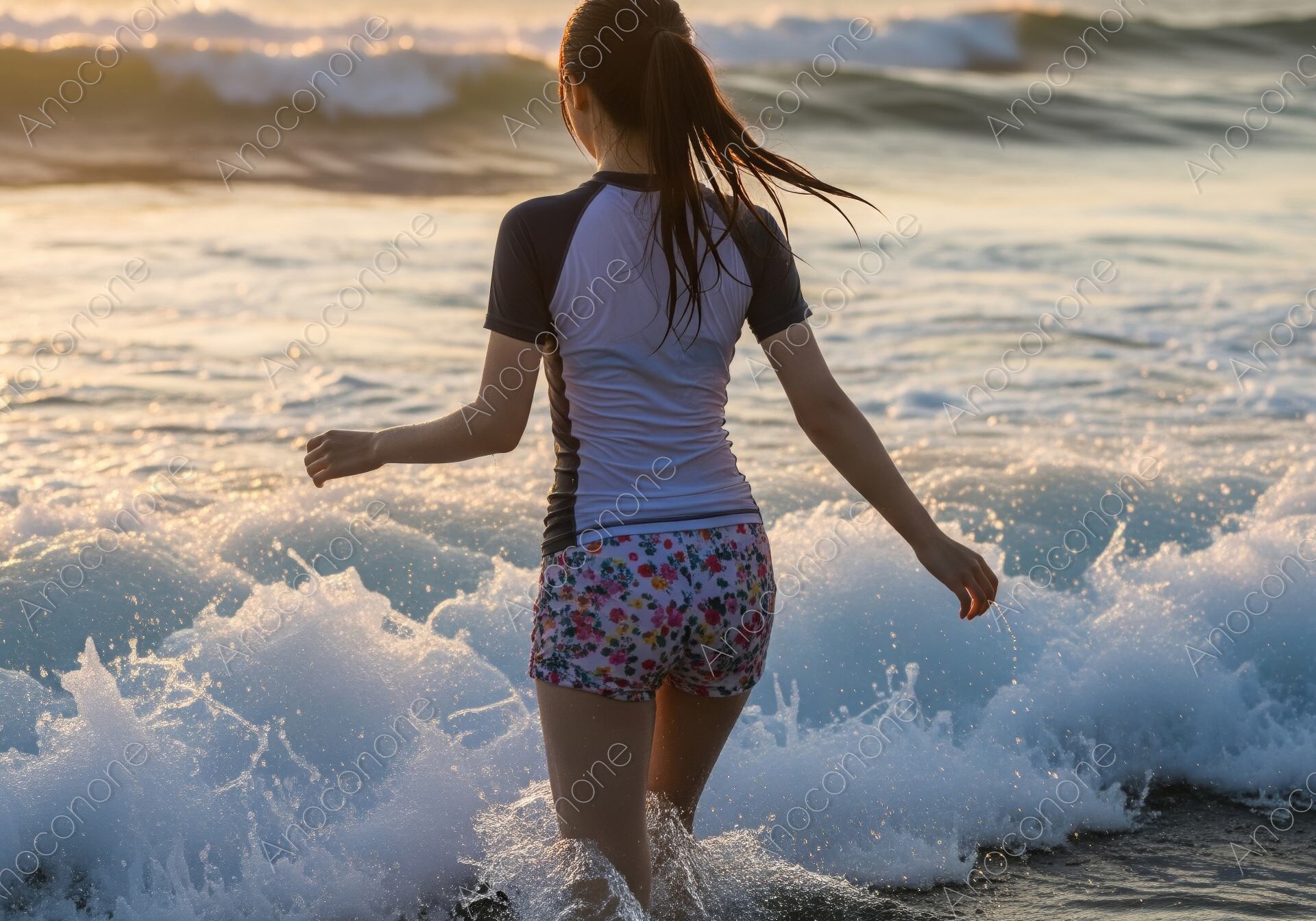 画像素材:日が傾き始めた夕暮れ時のビーチにて、波打ち際で水遊びを楽しむ女性の後ろ姿を捉えた一枚です。白と紺色のラッシュガードに、色鮮やかな花柄のショートパンツを合わせたスポーティーな装いが、夕日の柔らかな光に照らされて美しく映えています。目の前には勢いよく押し寄せる白い泡波が広がり、足元で弾ける水しぶきが躍動感のある瞬間を演出しています。画面全体が黄金色の光に包まれ、夏の終わりのような少しノスタルジックで穏やかな空気が漂っています。ポニーテールにまとめた髪が動きに合わせて揺れ、海という開放的な空間で心からリラックスしている様子が伝わります。水面の細かな反射や波の質感が丁寧に描写されており、見ているだけで潮騒を感じるような臨場感があります。夏のマリンレジャーやリゾート広告、健康的なライフスタイルを提案する媒体のビジュアルとしてお使いいただけます。