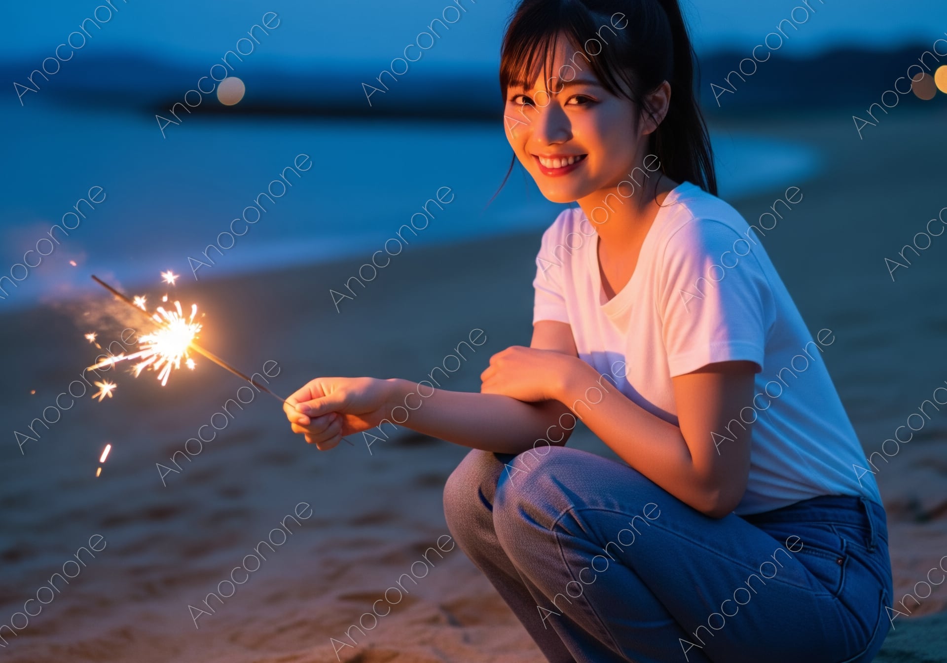 夏の夜のビーチで、カジュアルな服装の女性が砂浜にしゃがみ込み、手持ち花火の光を手に満面の笑みを浮かべています。暗闇に浮かび上がる花火の輝きと、彼女の明るい笑顔が、夏の夜の特別な時間を美しく演出しています。旅行、アウトドア、ライフスタイル、夏のイベントといったテーマの広告やウェブコンテンツに最適な、楽しさあふれる一枚です。
