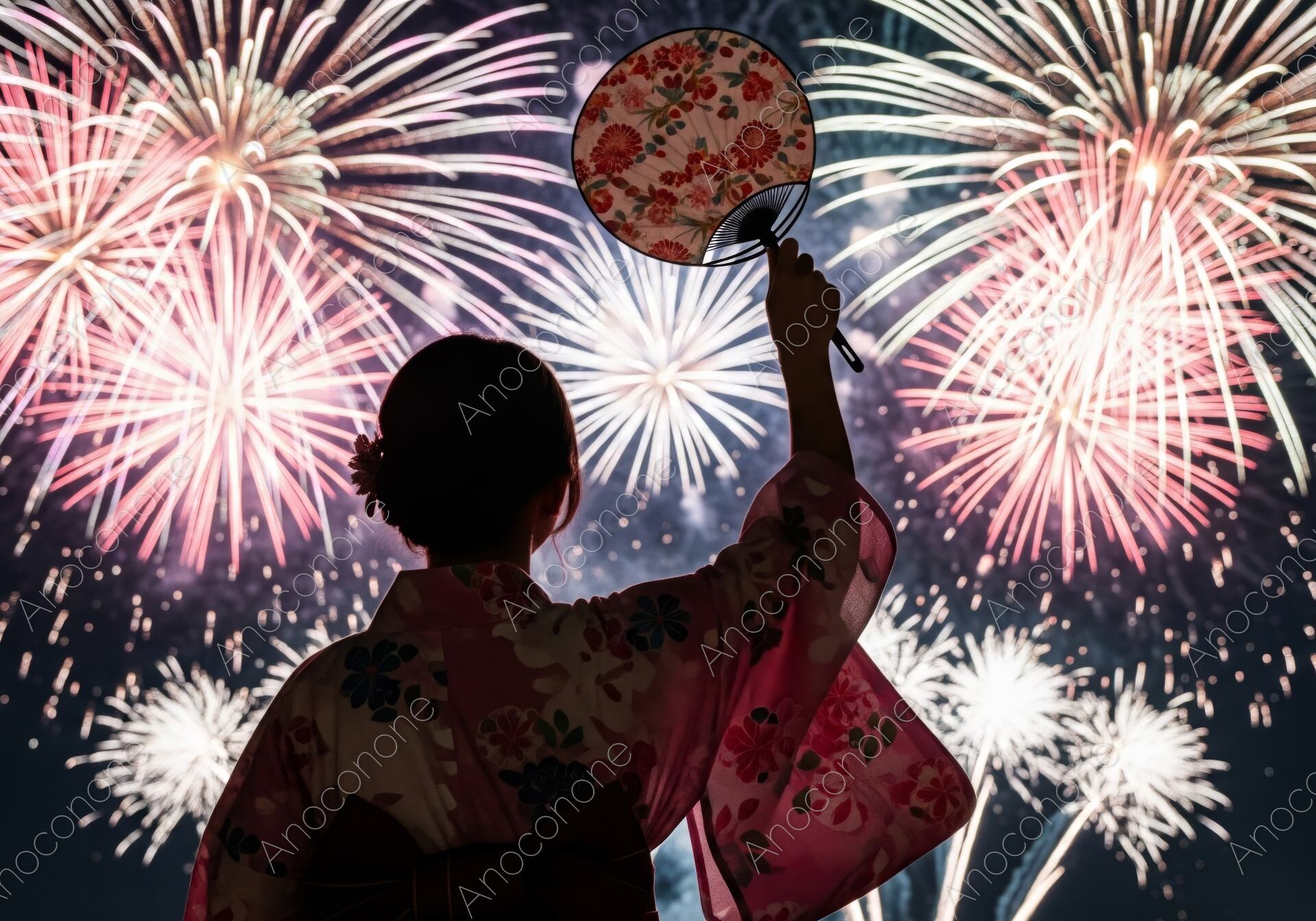 夜空を彩る色とりどりの大輪の花火を、うちわを掲げて見つめる浴衣姿の女性の後ろ姿です。空一面に広がる花火の迫力と、日本の夏の風情を感じさせる浴衣の姿が、忘れられない感動的な夜を表現しています。花火大会、夏のイベント、日本の伝統文化、旅行といったテーマの広告やウェブサイトに最適な、華やかで美しい一枚です。
