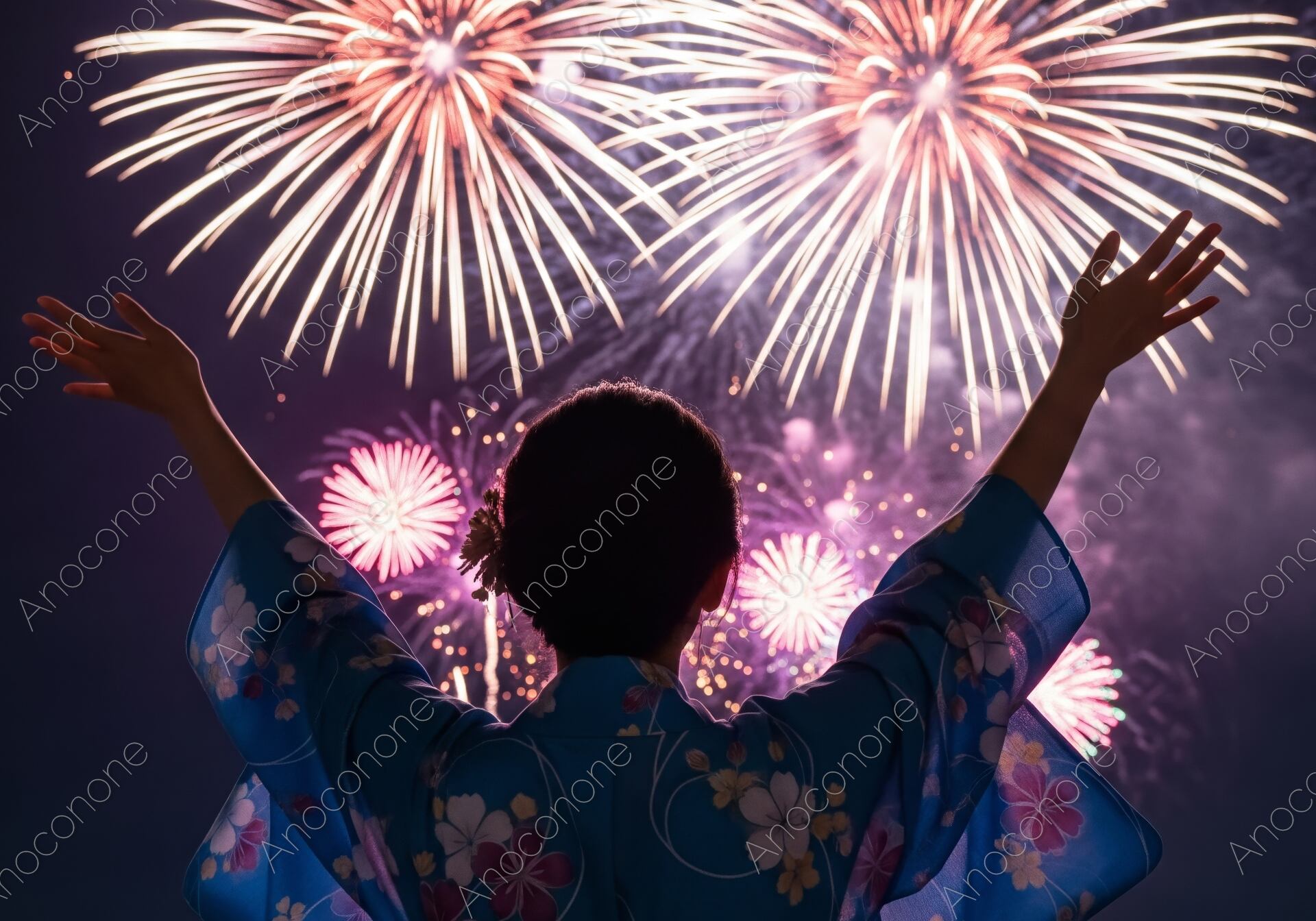 夜空を彩る大輪の花火を、両手を広げて見上げる浴衣姿の女性の後ろ姿です。空いっぱいに広がる花火の光と迫力が、彼女の開放的なポーズと相まって、夏の夜の最高の感動と喜びを表現しています。花火大会、夏のイベント、日本の伝統文化、喜びの瞬間といったテーマの広告やウェブコンテンツに最適な、エネルギッシュで印象的な一枚です。