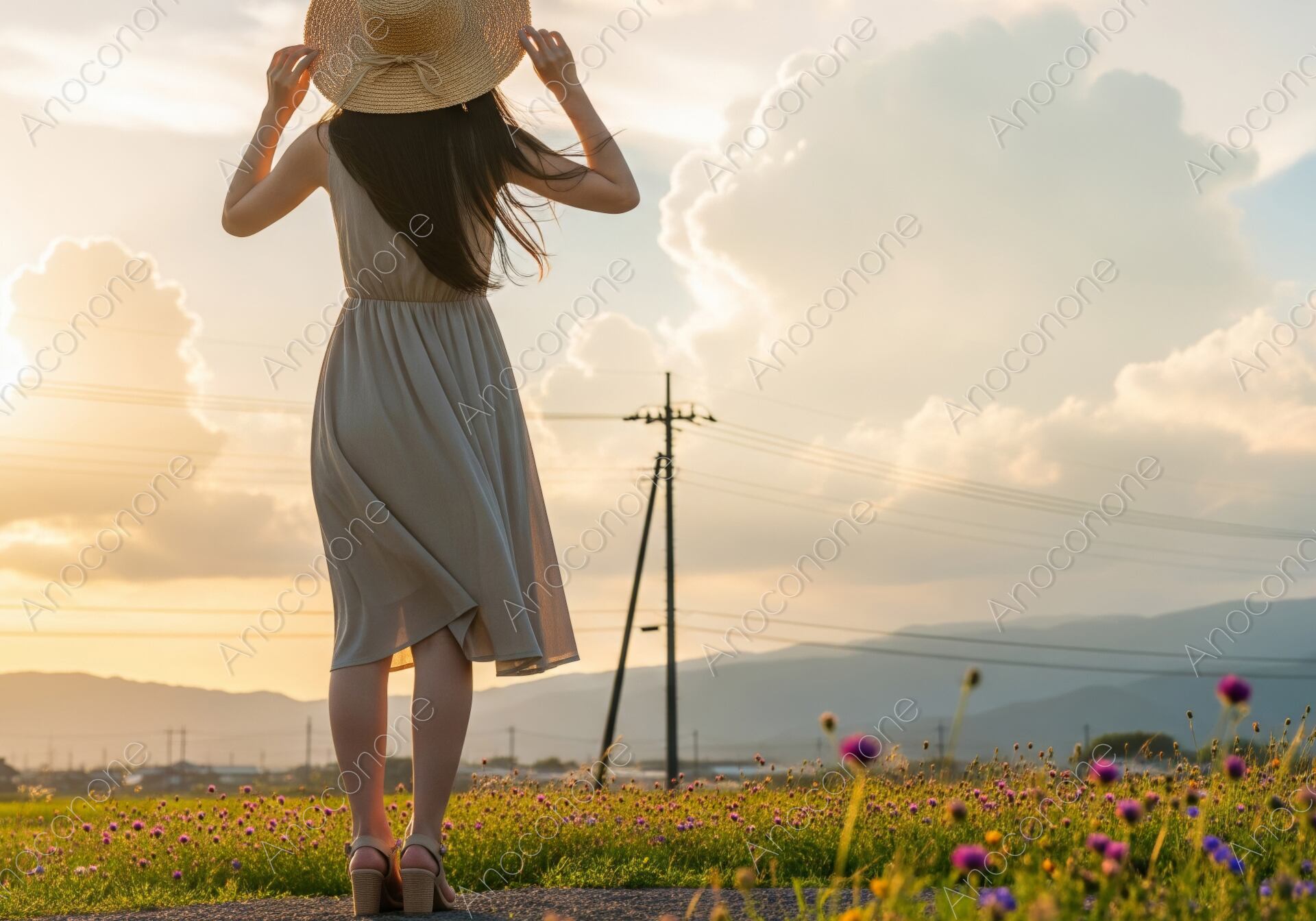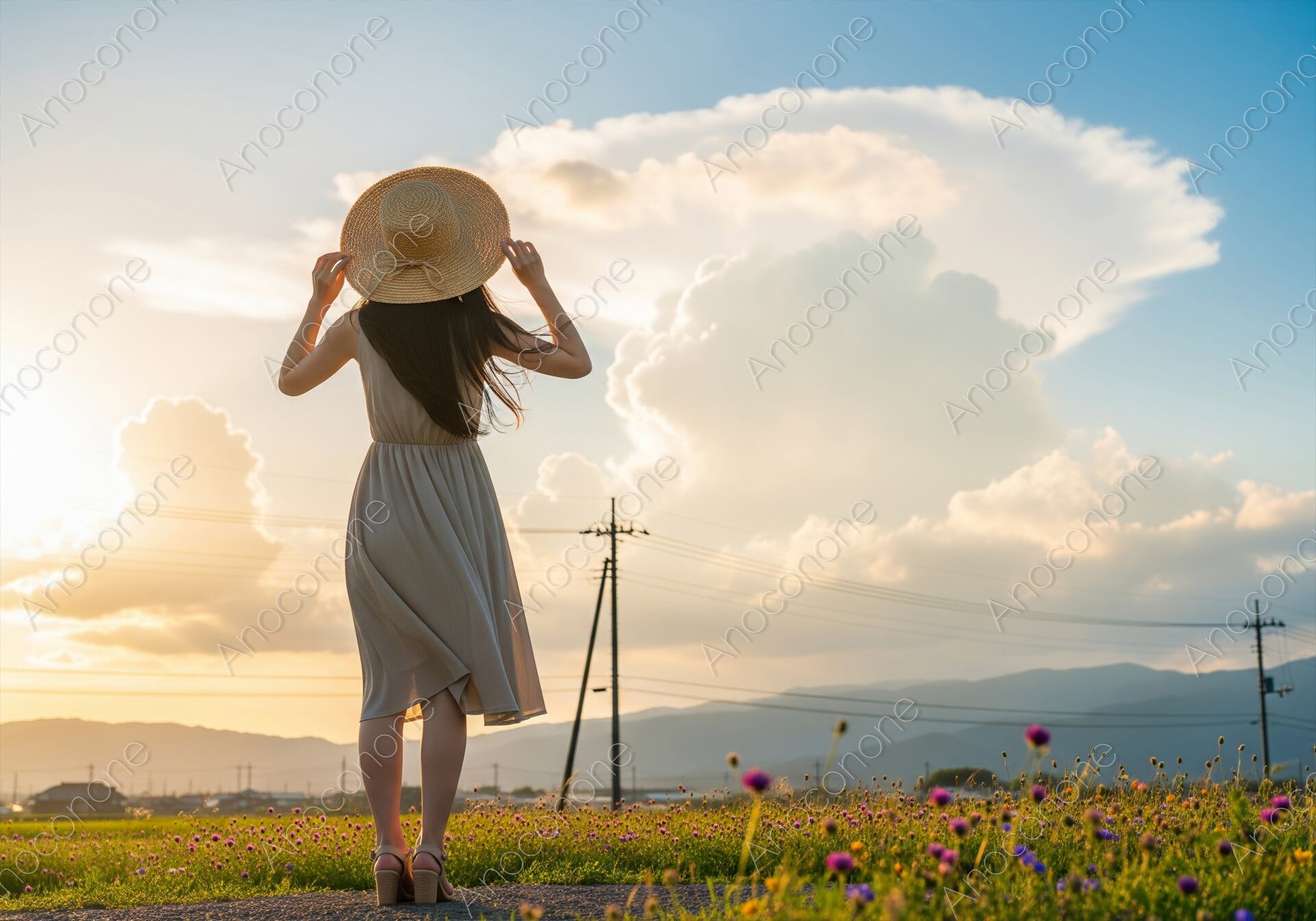 画像素材:夕日に照らされた広大な田園風景を舞台に、ベージュのワンピースを着て麦わら帽子を被った女性が後ろ姿で佇んでいる光景です。背景には、夕刻の光を受けて白く輝く巨大な入道雲がそびえ立ち、夏の終わりの情緒豊かな空気感を描き出しています。手前には紫色の小さな花々が咲き乱れる野原が広がり、遠くに見える山並みや電柱が日本の原風景のような懐かしさを演出しています。女性が帽子に手を添え、静かに空を見上げる仕草は、穏やかな時間の流れと旅の情感を感じさせます。画面全体が温かみのある黄金色の光に包まれており、ノスタルジックな雰囲気が特徴です。構図のバランスが良く、光の反射や雲の質感が細部まで丁寧に表現されています。夏の旅行や観光広告、ライフスタイルをテーマにした媒体のビジュアルとしてお使いいただけます。