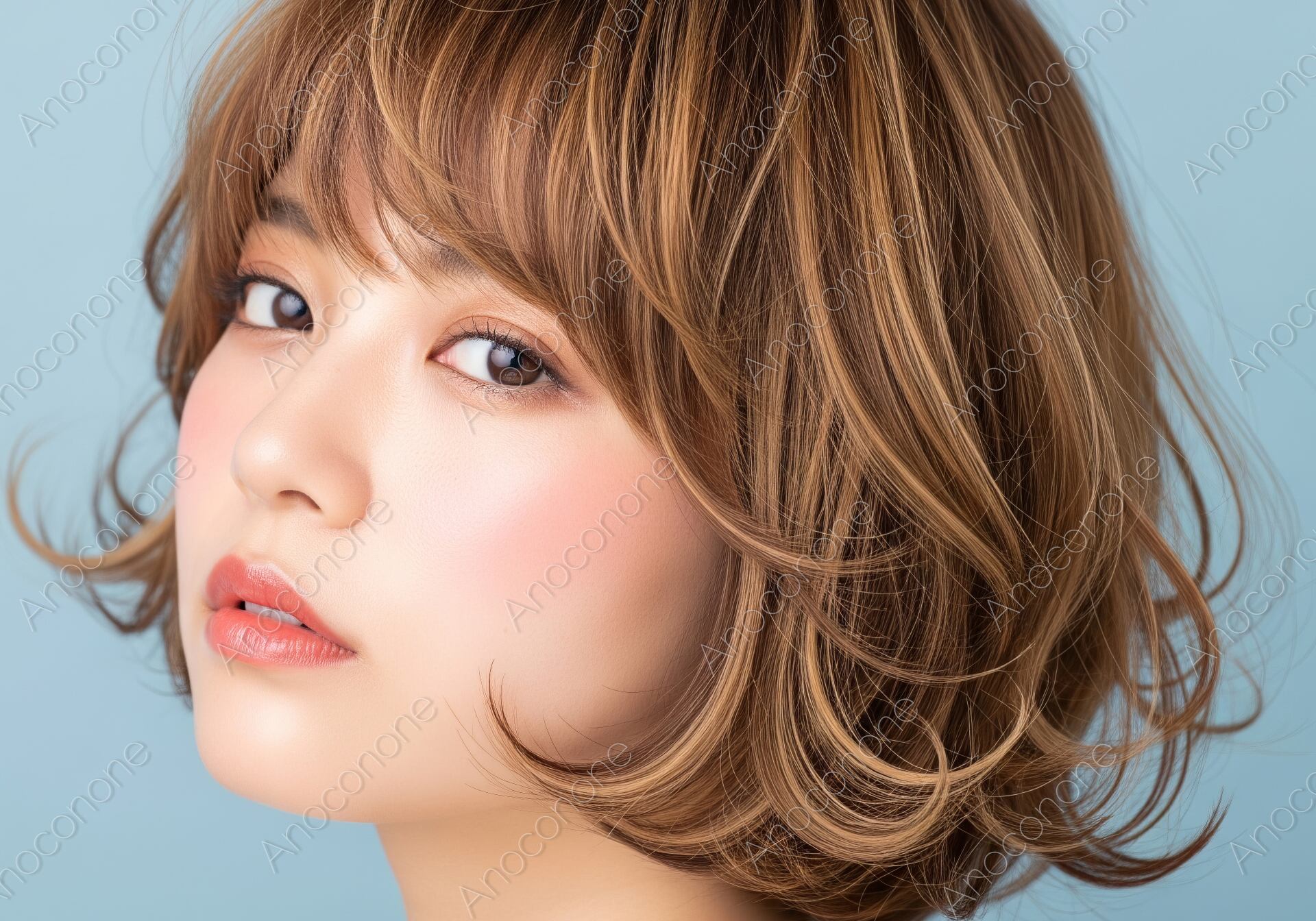 光に当たって美しく輝くハイライトカラーのボブヘアが魅力的な女性のポートレートです。毛先に動きのあるパーマと、血色感のあるメイクが、健康的でトレンド感のあるスタイルを演出しています。ヘアスタイル、美容、ファッション、メイクといったテーマの広告やウェブコンテンツに最適な、洗練された魅力を持つ一枚です。