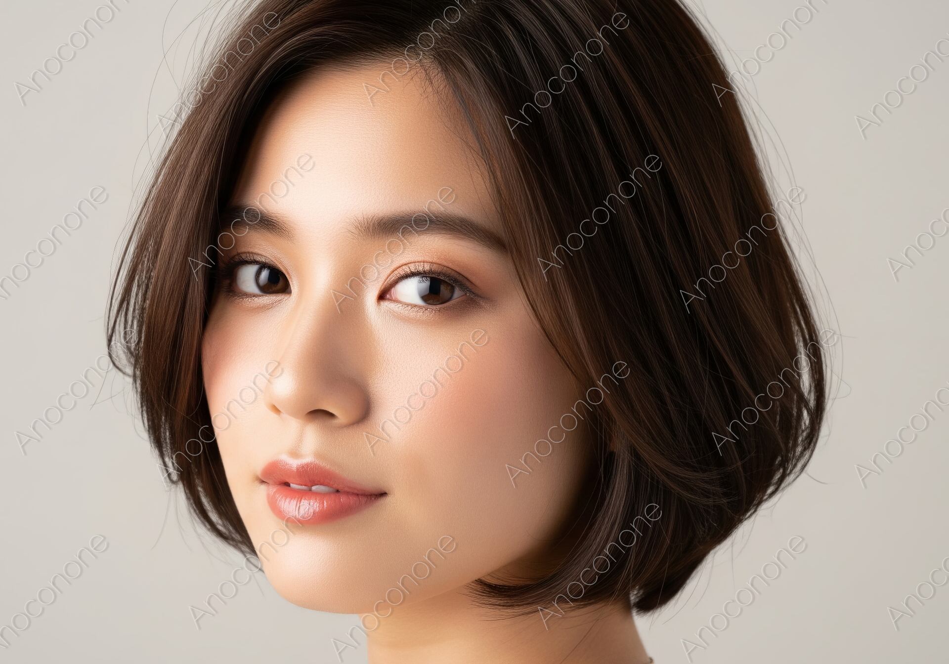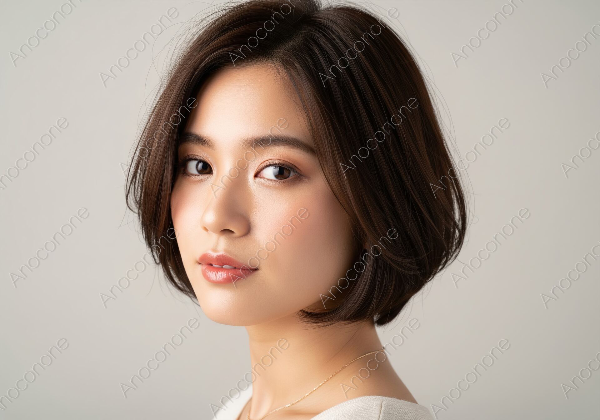 洗練されたストレートボブが魅力的な女性のクローズアップポートレートです。カメラをまっすぐに見つめる自信に満ちた表情と、首元のネックレスが、上品で知的な印象を与えます。ヘアサロン、美容、ビジネス、ライフスタイルといったテーマの広告やウェブコンテンツに最適な、洗練された魅力を持つ一枚です。