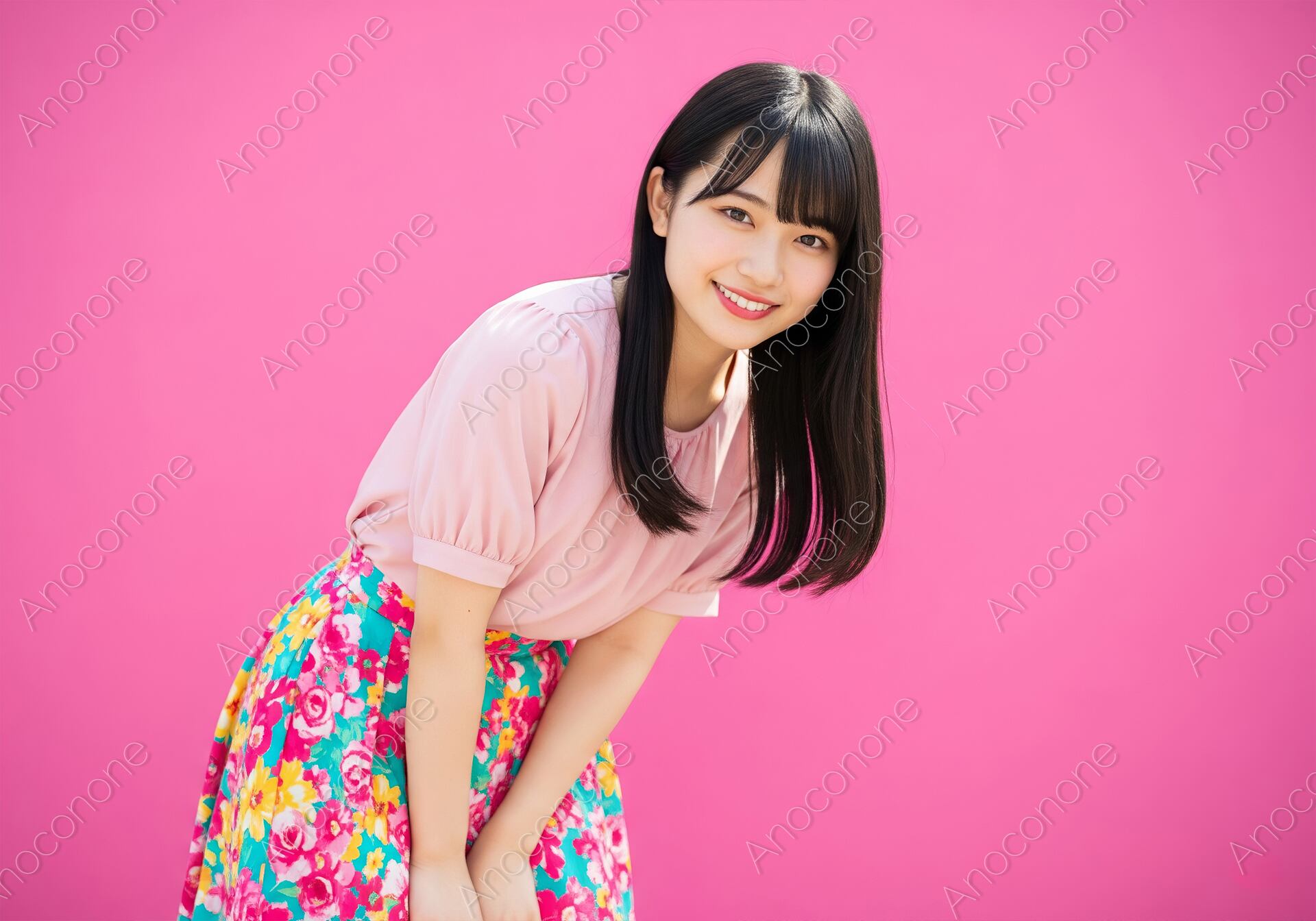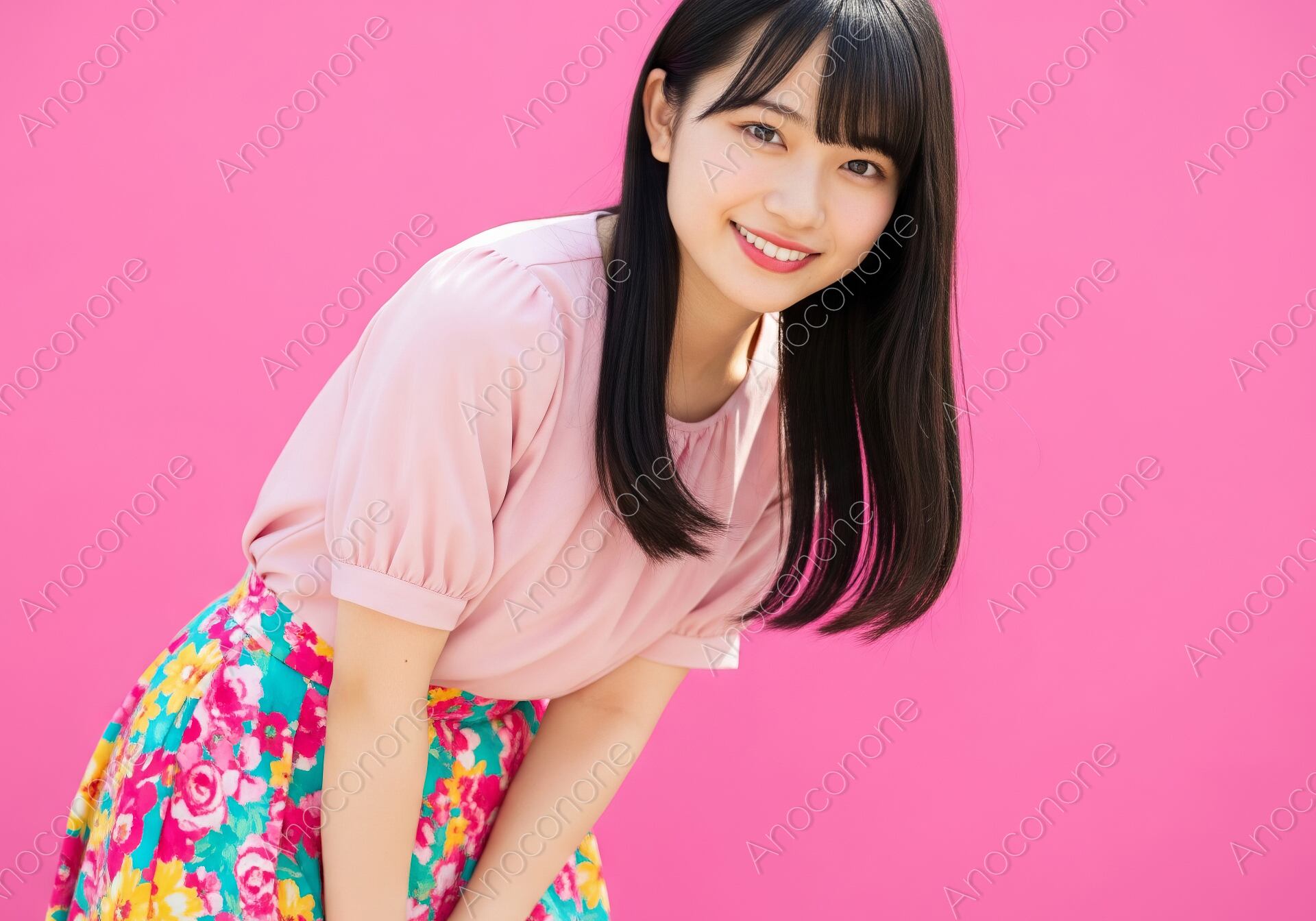 画像素材:鮮やかなビビッドピンクの背景に、カラフルな花柄のフレアスカートと優しいピンクのブラウスを合わせた、多幸感あふれる夏ファッションのポートレートです。少し首をかしげて微笑む女性の表情は、ピュアでチャーミングな魅力を放ち、見る人の心を明るく晴れやかにします。艶やかな黒髪のストレートヘアが、華やかなコーディネートを引き締め、清潔感のある美しさを際立たせています。コントラストの効いた色彩設計は視認性が高く、一目で季節感とトレンドを伝える力強いビジュアルとなっています。アパレル通販サイトの夏物キャンペーン、コスメや美容関連のSNSプロモーション、あるいは「元気」や「ときめき」をテーマにした広告・エディトリアル素材として、目を引くアイキャッチに最適な一枚です。