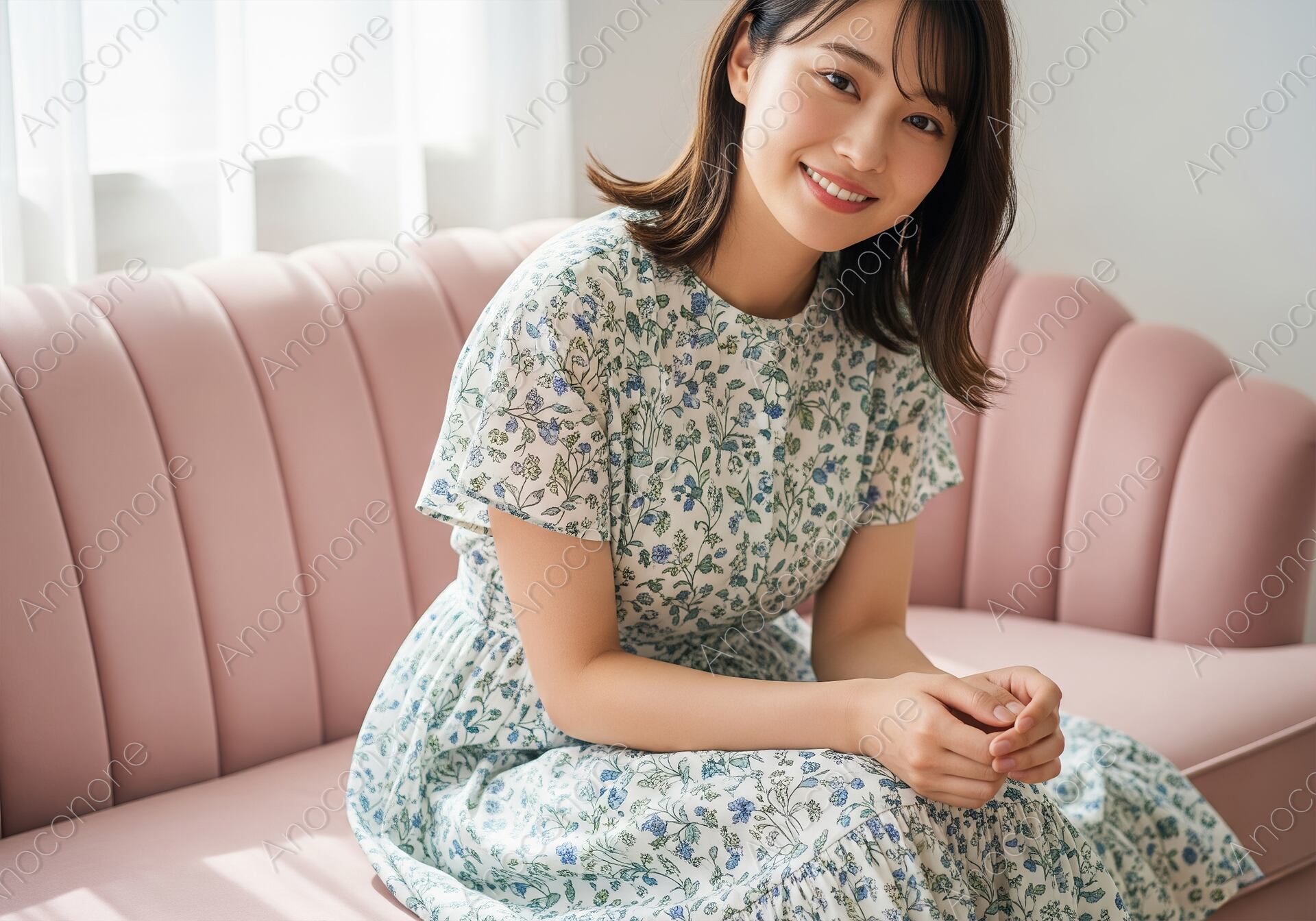 画像素材:淡いブルーとグリーンの小花柄が可憐な半袖ワンピースを纏い、ピンクのソファでくつろぐ女性のポートレートです。外ハネのニュアンスを加えたボブヘアと、優しく微笑む表情が、親しみやすさと上品な大人の可愛らしさを演出しています。窓から差し込む柔らかな自然光が、被写体の瑞々しい肌の質感とワンピースの軽やかな素材感を引き立て、清潔感あふれる穏やかな空気感を作り出しています。おうち時間や休日のリラックスシーンをイメージしたアパレル広告、インテリア・雑貨関連のイメージビジュアル、また「自分を労わる時間」をテーマにしたライフスタイルメディアのアイキャッチとして、高い訴求力を持つ一枚です。