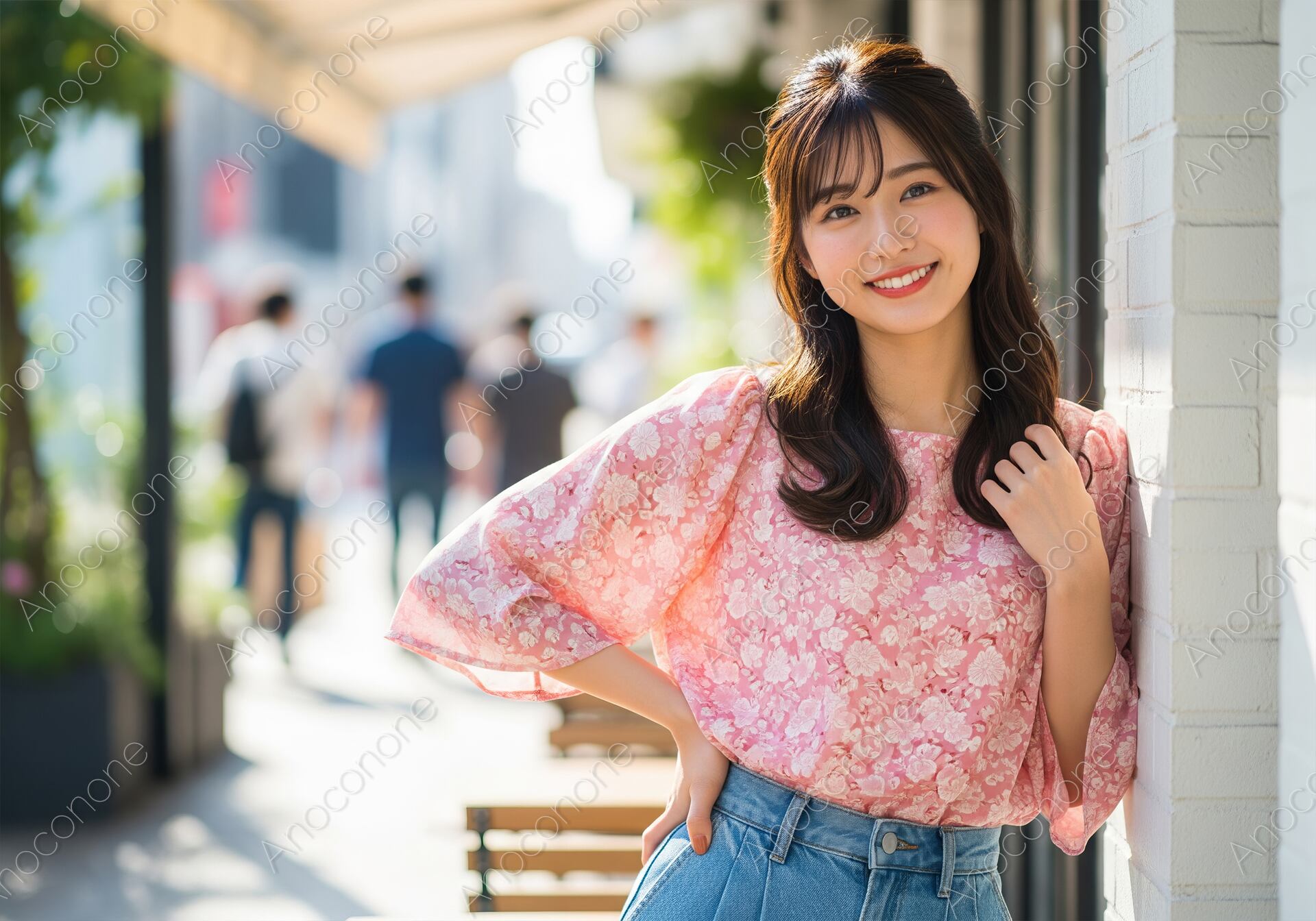 画像素材:明るい日差しが差し込む街角のカフェテラスを背景に、華やかなピンクの花柄シフォンブラウスを纏った女性のポートレートです。ふんわりとしたパフスリーブと、風に揺れるような軽やかな素材感が、夏のお出かけにぴったりなフェミニンで涼しげな印象を与えます。ハーフアップに整えた艶やかなロングヘアと、カメラに向かって屈託のない笑顔を向ける表情が、見る人にポジティブで幸福感あふれるイメージを届けます。背景のボケ味が被写体の存在感を際立たせ、都会的な洗練さと親しみやすさが同居する美しいビジュアルに仕上がっています。夏の新作ファッションのプロモーション、週末のライフスタイルを提案するカタログ、または「街歩き」や「デート」をテーマにした広告媒体のメインカットとして、高い訴求力を発揮する一枚です。