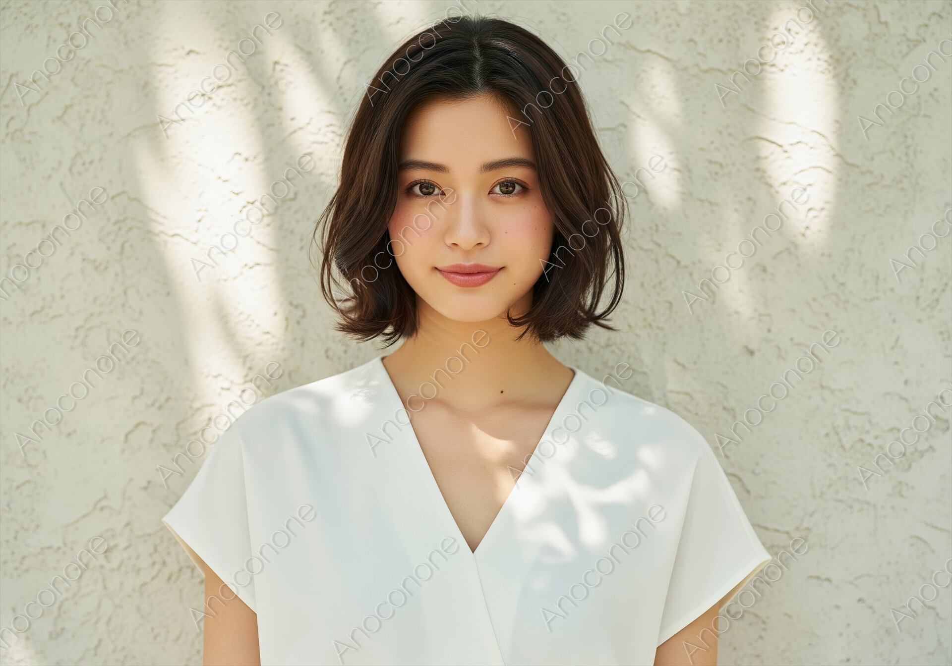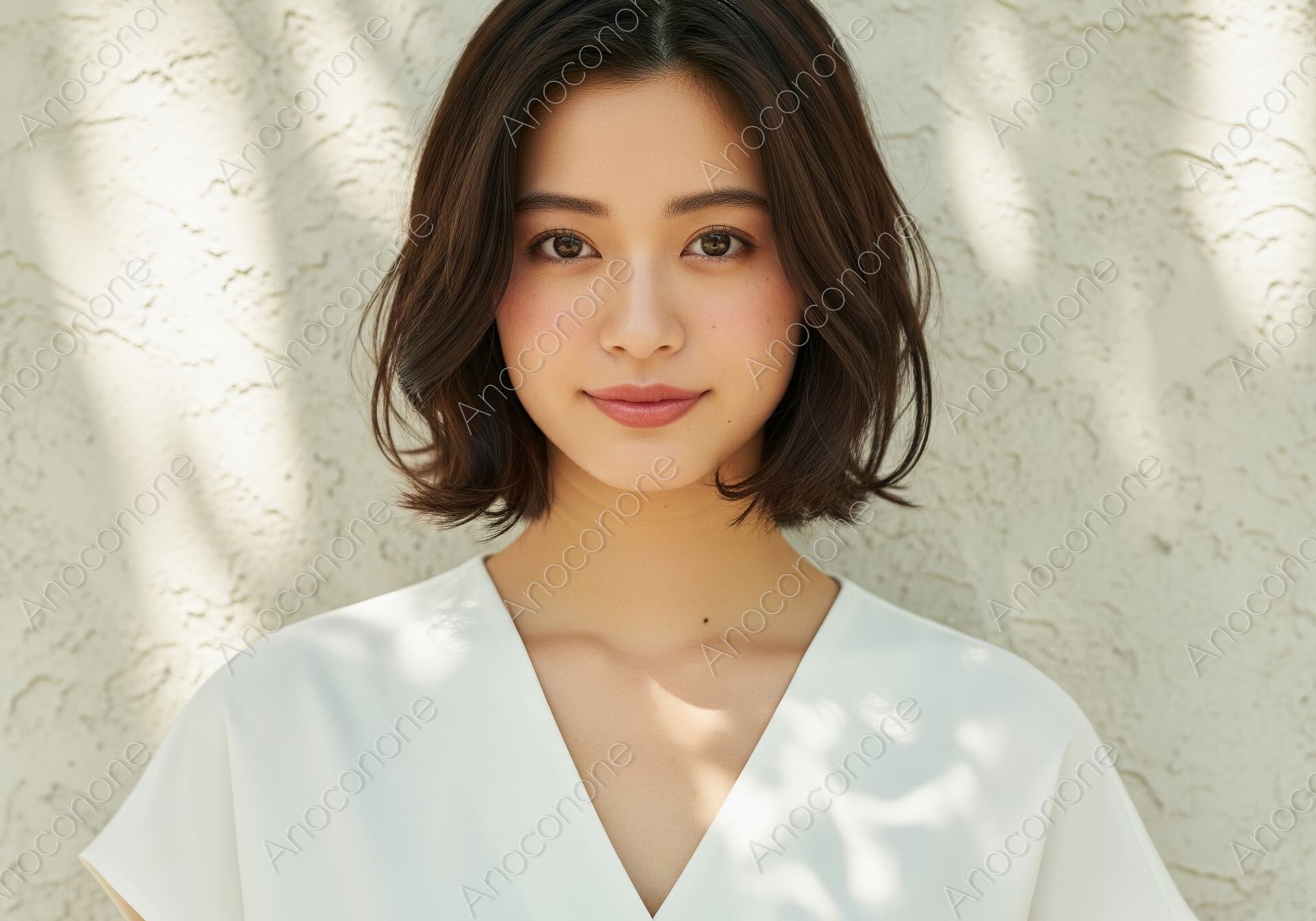 画像素材:柔らかな木漏れ日が差し込む白い壁を背景に、真っ白なVネックのブラウスを纏った女性のポートレートです。デコルテを美しく見せるシャープなVラインと、顔周りに柔らかな動きをつけたニュアンスボブの組み合わせが、都会的な洗練さとナチュラルな気品を同時に演出しています。正面を見つめる穏やかで知的な眼差しと、控えめな微笑みが、見る人に深い信頼感と清潔感を与えます。自然光が作り出す繊細な陰影が、被写体の端正な顔立ちと瑞々しい肌の質感をより一層引き立てています。スキンケアやヘアケアブランドのイメージビジュアル、高品質なアパレル広告、また「自分を大切にするライフスタイル」をテーマにしたエディトリアル素材に最適な、上質な一枚です。