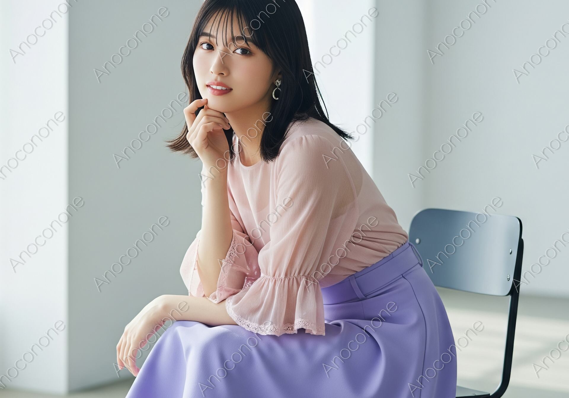 画像素材:洗練されたミニマルなスタジオ空間で、柔らかなピンクのシアーブラウスと鮮やかなラベンダーのフレアスカートを纏った女性のポートレートです。袖口のフリルと透け感が、夏の装いに軽やかさと繊細な女性らしさを添えています。椅子に腰かけ、顎に手を添えた優雅なポーズと、こちらを真っ直ぐに見つめる凛とした眼差しが、知的な美しさを際立たせています。黒髪のミディアムボブが全体の淡いトーンを引き締め、落ち着いた大人の気品を演出。自然光が優しく差し込む背景の陰影が、衣装の質感と被写体の透明感をより一層引き立てています。上質なアパレルブランドのカタログ、美容・コスメ関連のイメージビジュアル、また「自分を磨く」をテーマにしたライフスタイルメディアのメインカットとして、高いクオリティを約束する一枚です。