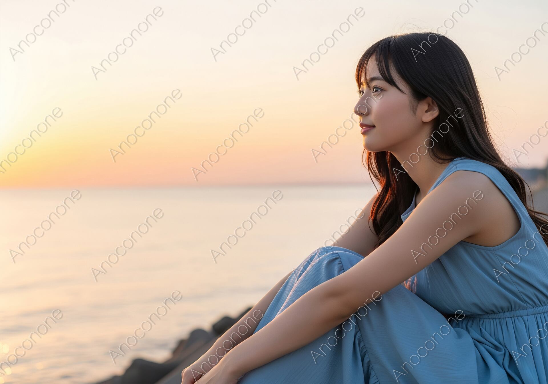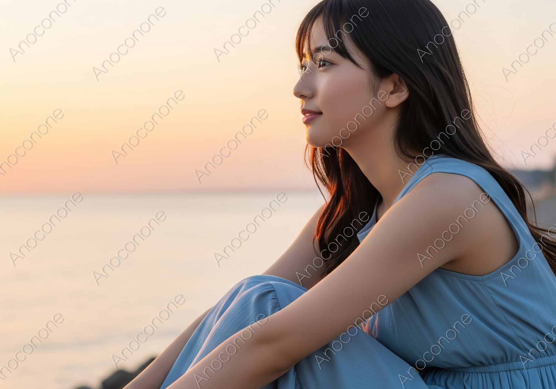 画像素材:黄金色の夕陽が水平線に沈みゆく静かな海辺で、テトラポットに腰かけ遠くを見つめる女性のポートレートです。涼しげなスカイブルーのノースリーブワンピースが、暖色の夕景の中で美しく際立ち、清廉でドラマチックなコントラストを描いています。風にそよぐ艶やかな黒髪と、柔らかな光を浴びた端正な横顔からは、夏の終わりのようなノスタルジーと、未来への希望を感じさせる凛とした美しさが漂います。海からの照り返しが被写体を優しく包み込み、映画のワンシーンのような情緒あふれる世界観を演出。夏の旅行やバカンスのプロモーション、物語性を重視するライフスタイルメディアの表紙、また「癒やし」や「自分を見つめ直す時間」をテーマにした広告素材として、見る人の心に深く訴えかける高品質な一枚です。