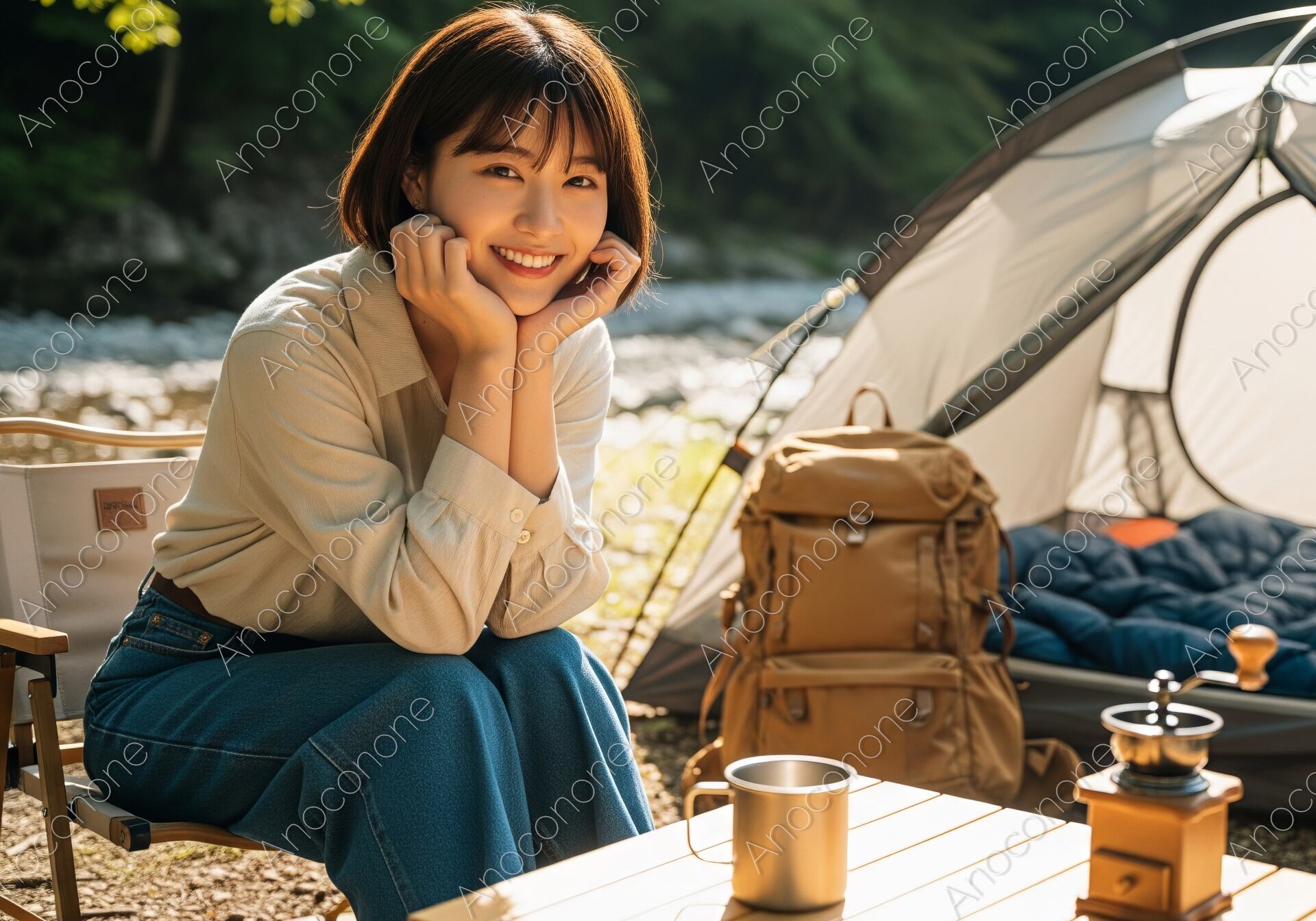 画像素材:豊かな緑と透き通るような川のほとりで、キャンプを楽しむ女性のポートレートです。使い込まれたコーヒーミルとマグカップ、機能的なテント、そして無造作に置かれたバックパックが、本格的ながらも洗練された「ソロキャンプ」のスタイルを象徴。ベージュのシャツとデニムという飾らない装いが、大自然の中で過ごすリラックスした空気感を際立たせています。頬杖をついて穏やかに微笑む彼女の表情は、日常の喧騒を離れ、心身ともにリフレッシュする至福の時間を表現しています。アウトドアギアの広告、キャンプ場やレジャーのプロモーション、また「自分を整える旅」や「週末の過ごし方」を提案するライフスタイルメディアのメインビジュアルに最適な、非常にクオリティの高い一枚です。