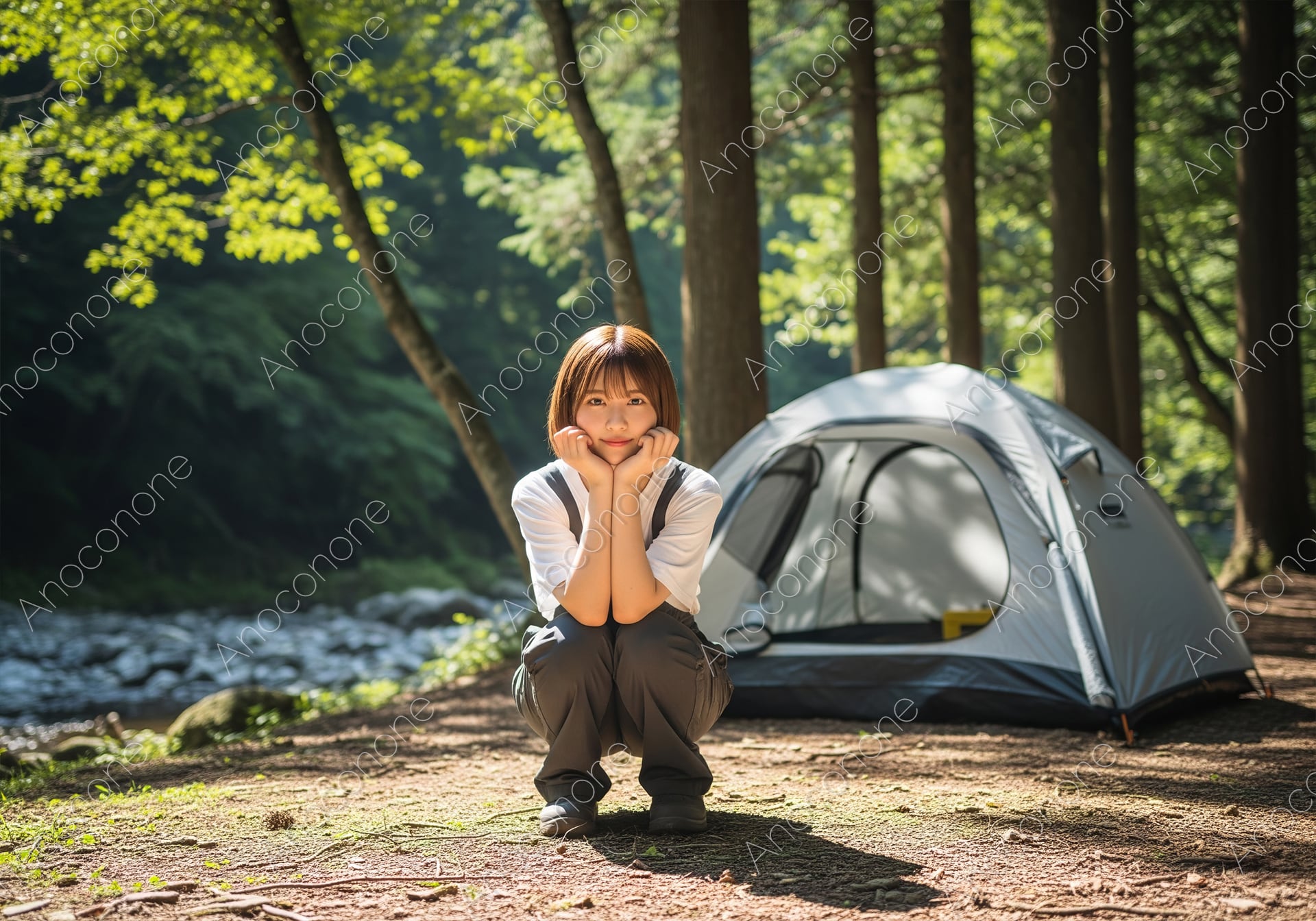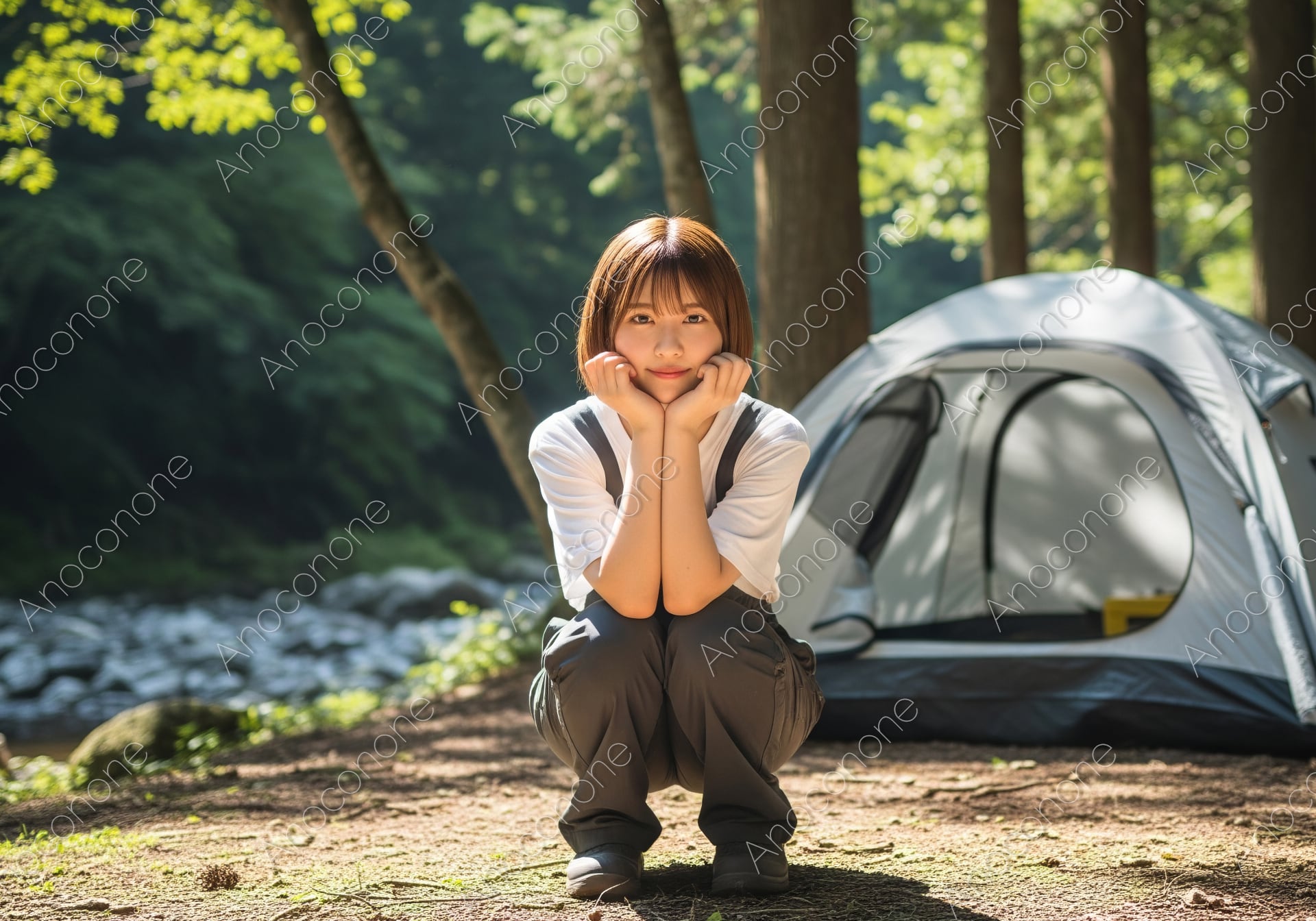 画像素材:木漏れ日が降り注ぐ深い森の中、清流を間近に臨むキャンプサイトでのポートレートです。白いTシャツに動きやすいワークパンツを合わせたシンプルな装いで、自然体のままアウトドアを楽しむ女性の姿を切り取っています。背後に設営されたコンパクトなドームテントと、周囲を囲む高い木々が、日常の喧騒から切り離された「自分だけの静かな空間」を象徴。地面に直接しゃがみ込み、頬杖をついてこちらを見つめる無垢な表情が、大自然の中だからこそ引き出されるリラックスした魅力を伝えています。ソロキャンプやブッシュクラフトの特集、アウトドアブランドのイメージビジュアル、また「デジタルデトックス」や「マインドフルネス」をテーマにしたコンテンツに最適な、空気感まで伝わる高品質な一枚です。