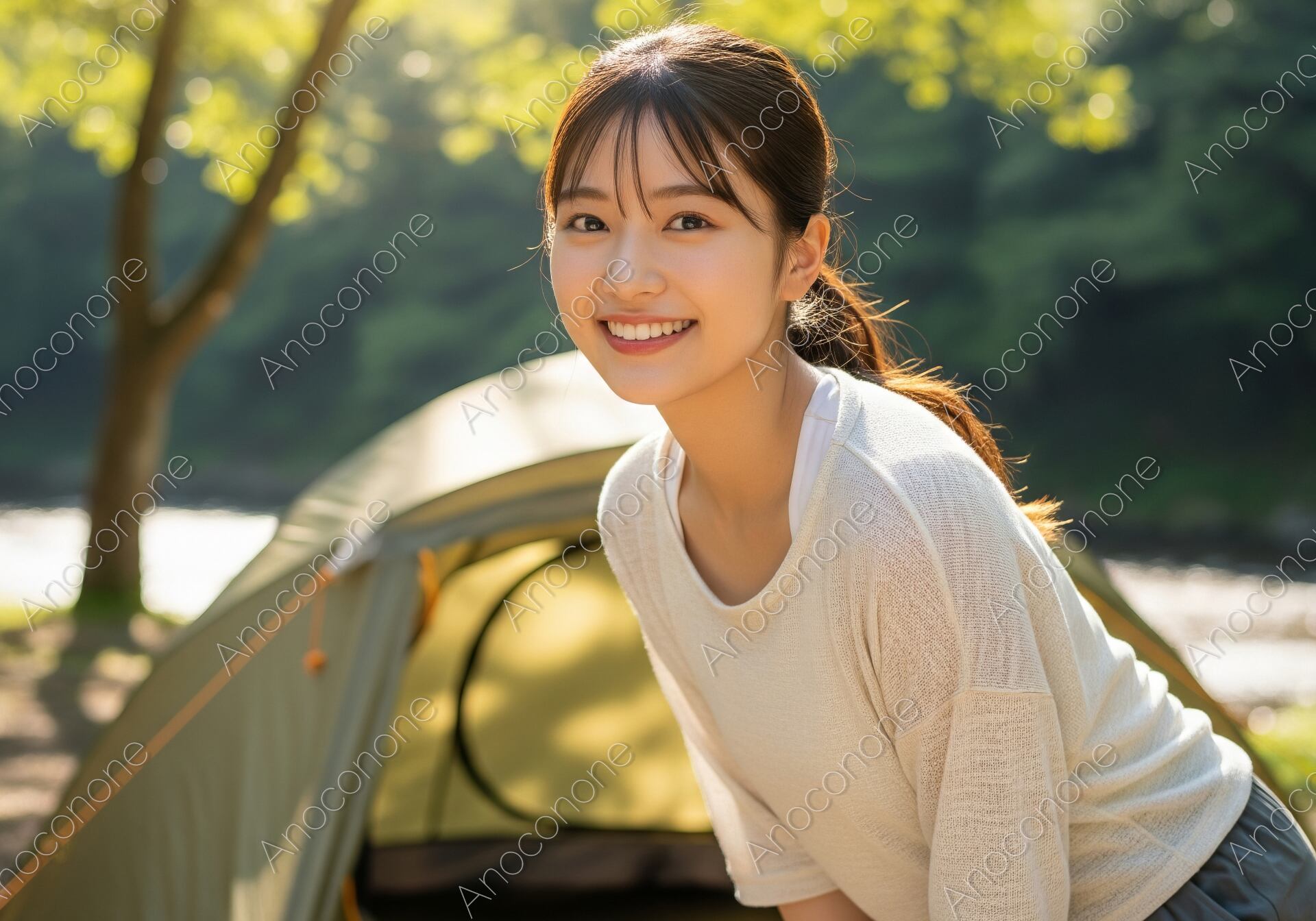画像素材:清流のせせらぎと柔らかな木漏れ日に包まれた、絶好のロケーションでのキャンプシーンです。清潔感のあるオフホワイトのサマーニットを纏い、カメラに向かって屈託のない笑顔を見せる女性のポートレート。背後に設営された本格的なソロテントと、キラキラと輝く川面のコントラストが、夏の野外活動の爽快感を際立たせています。自然光が彼女の肌や髪を美しく照らし出し、健康的で透明感あふれる美しさを引き立てています。アウトドアギアのプロモーションはもちろん、週末のデトックス旅行、自分を慈しむソロ活、また「自然の中での丁寧な暮らし」をテーマにしたライフスタイルメディアに最適な、多幸感あふれる高品質な一枚です。