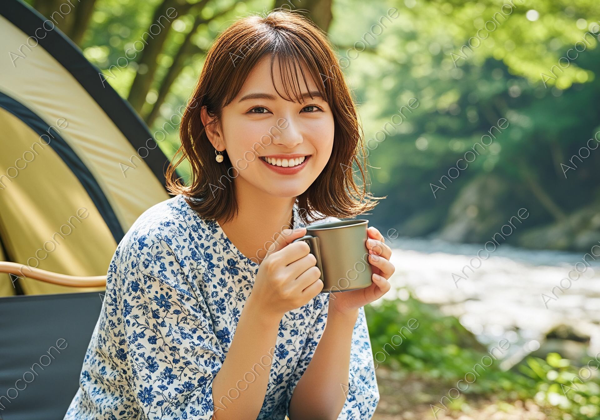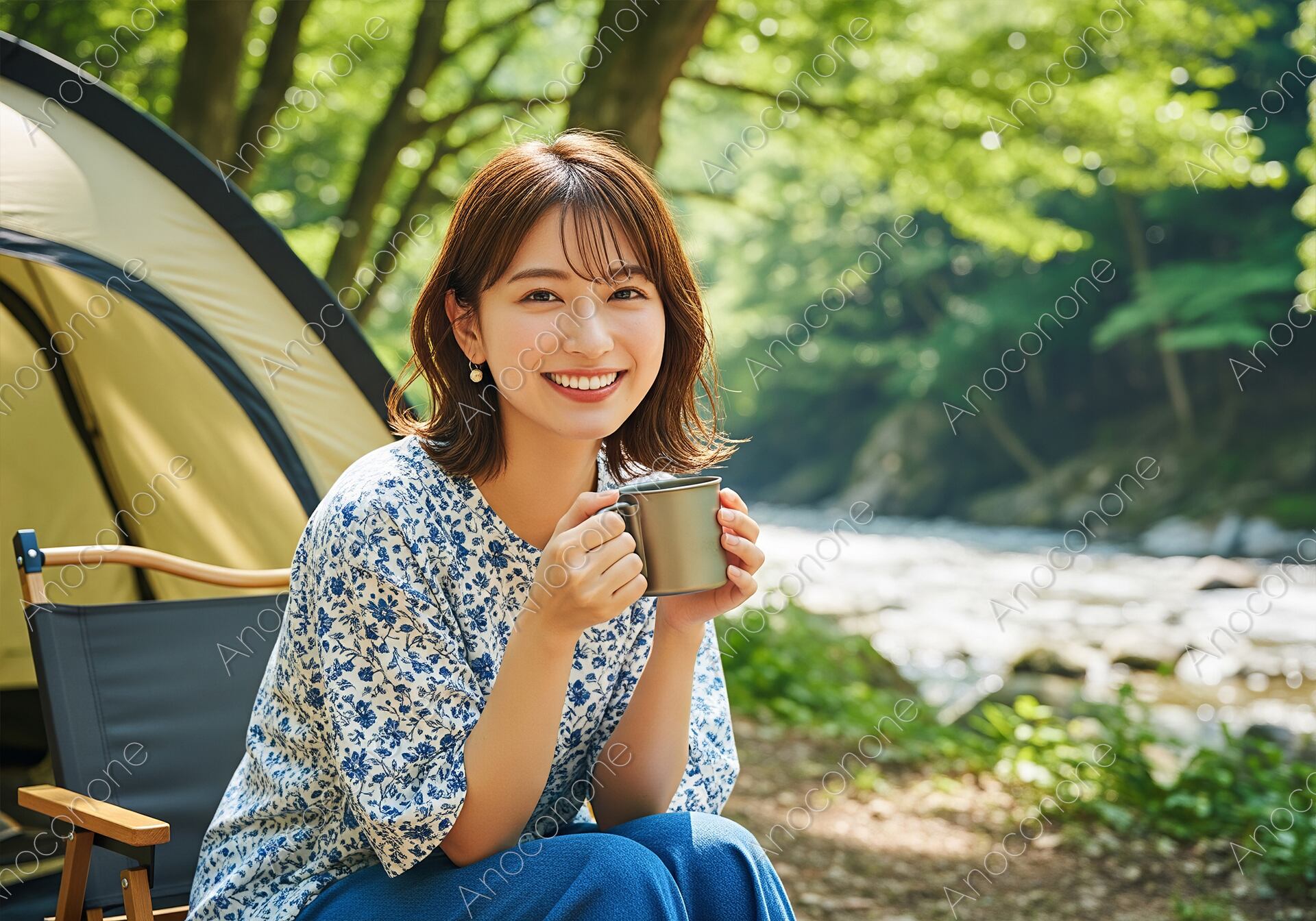 画像素材:陽光がキラキラと降り注ぐ新緑の森、透き通った川のほとりでキャンプを楽しむ女性のポートレートです。白地にブルーの花柄をあしらった軽やかなブラウスが、アウトドアシーンに華やかさと大人の可愛らしさをプラス。手にしたチタンマグから立ち上る温かな空気感と、カメラに向かって優しく微笑む彼女の表情が、心からリラックスした至福の時間を描き出しています。背景に設営されたテントや木漏れ日のボケ味が、日常の喧騒を忘れる「自分だけの静かな旅」を象徴。ソロキャンプの特集記事、女性向けアウトドアウェアの広告、また「週末のリフレッシュ」や「自然の中での自分磨き」をテーマにしたSNSやライフスタイルメディアのメインビジュアルに最適な、非常にクオリティの高い一枚です。