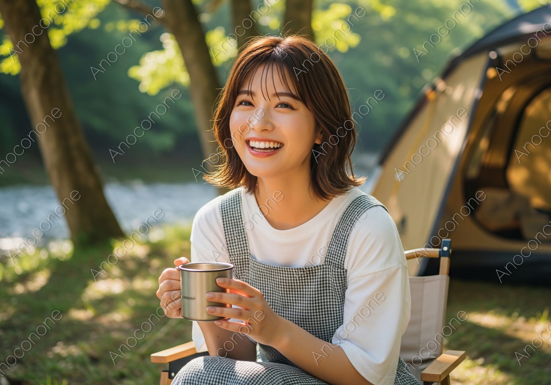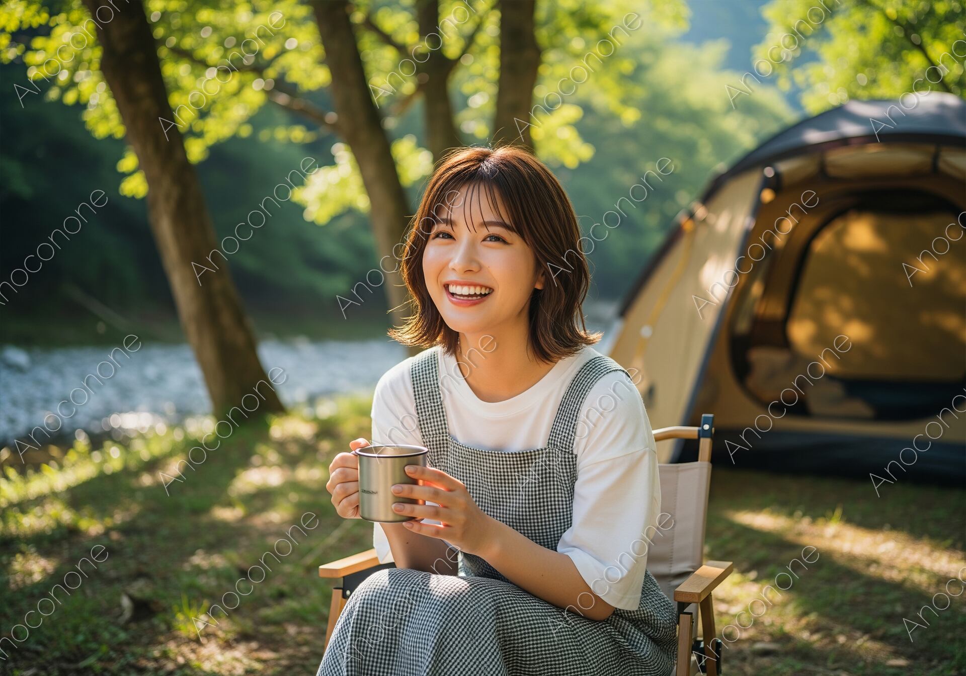 画像素材:清流のせせらぎが聞こえる明るい森の中で、キャンプを満喫する女性のポートレートです。白いTシャツにギンガムチェックのサロペットを合わせた、大人可愛いカジュアルなアウトドアスタイル。手にしたマグカップから伝わる温もりと、カメラに向かって弾けるような笑顔が、日常のストレスから解放された最高のリフレッシュタイムを象徴しています。背景には木漏れ日に輝く新緑と機能的なドームテントが広がり、自然の中での「丁寧な暮らし」や「ソロ活」の魅力をドラマチックに演出。アウトドア用品のプロモーション、週末のレジャー特集、また「自分を癒やす旅」をテーマにした広告やSNSのメインビジュアルに最適な、多幸感あふれる高品質な一枚です。