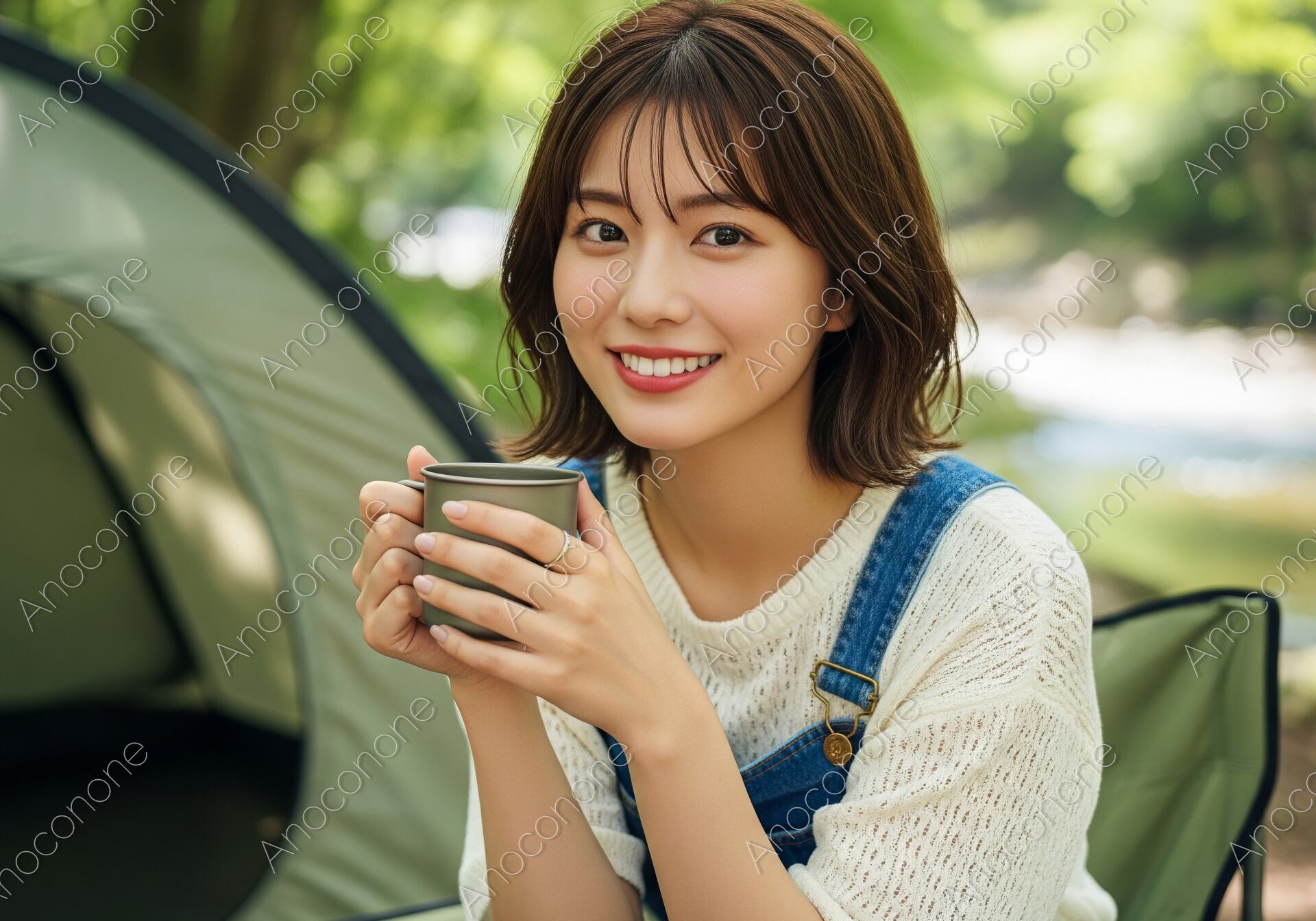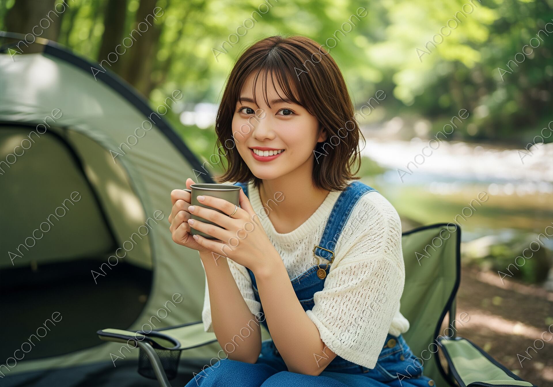 画像素材:清流が間近に流れる絶好のキャンプスポットで、リラックスしたひとときを過ごす女性のポートレートです。白い透かし編みのサマーニットにデニムのサロペットを合わせた、健康的で可愛らしいアウトドアファッション。手元には温かな飲み物が入ったキャンプマグがあり、カメラを見つめる彼女の穏やかで瑞々しい笑顔が、大自然の中での心地よさを物語っています。背景には新緑の木漏れ日とコンパクトなテントが広がり、日常を忘れて自分を取り戻す「ソロキャンプ」や「リフレッシュ旅」の魅力を凝縮した一枚です。アウトドア用品のプロモーション、週末のレジャー特集、また「自然との共生」をテーマにした広告ビジュアルとして、非常に訴求力の高い高品質な素材です。