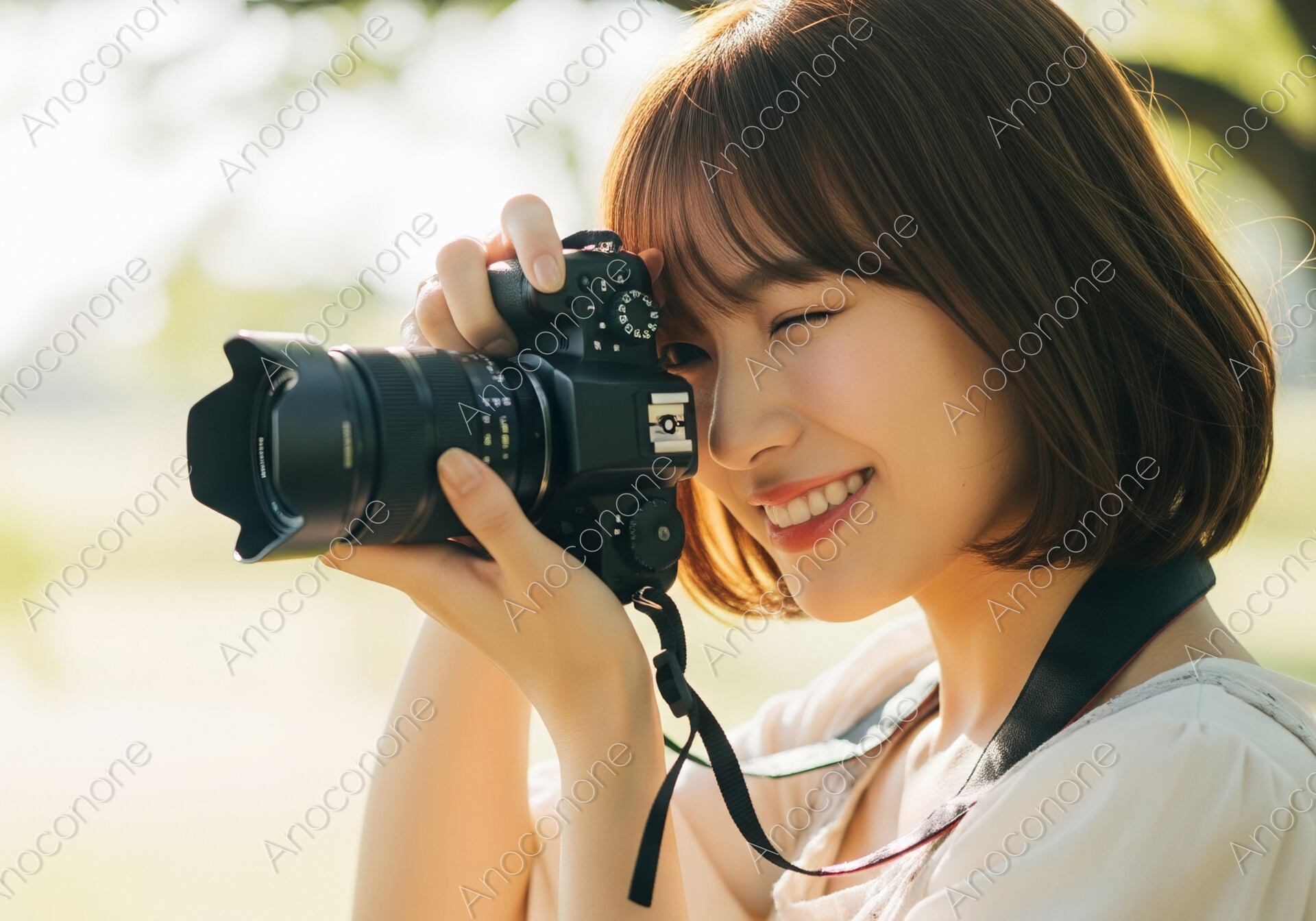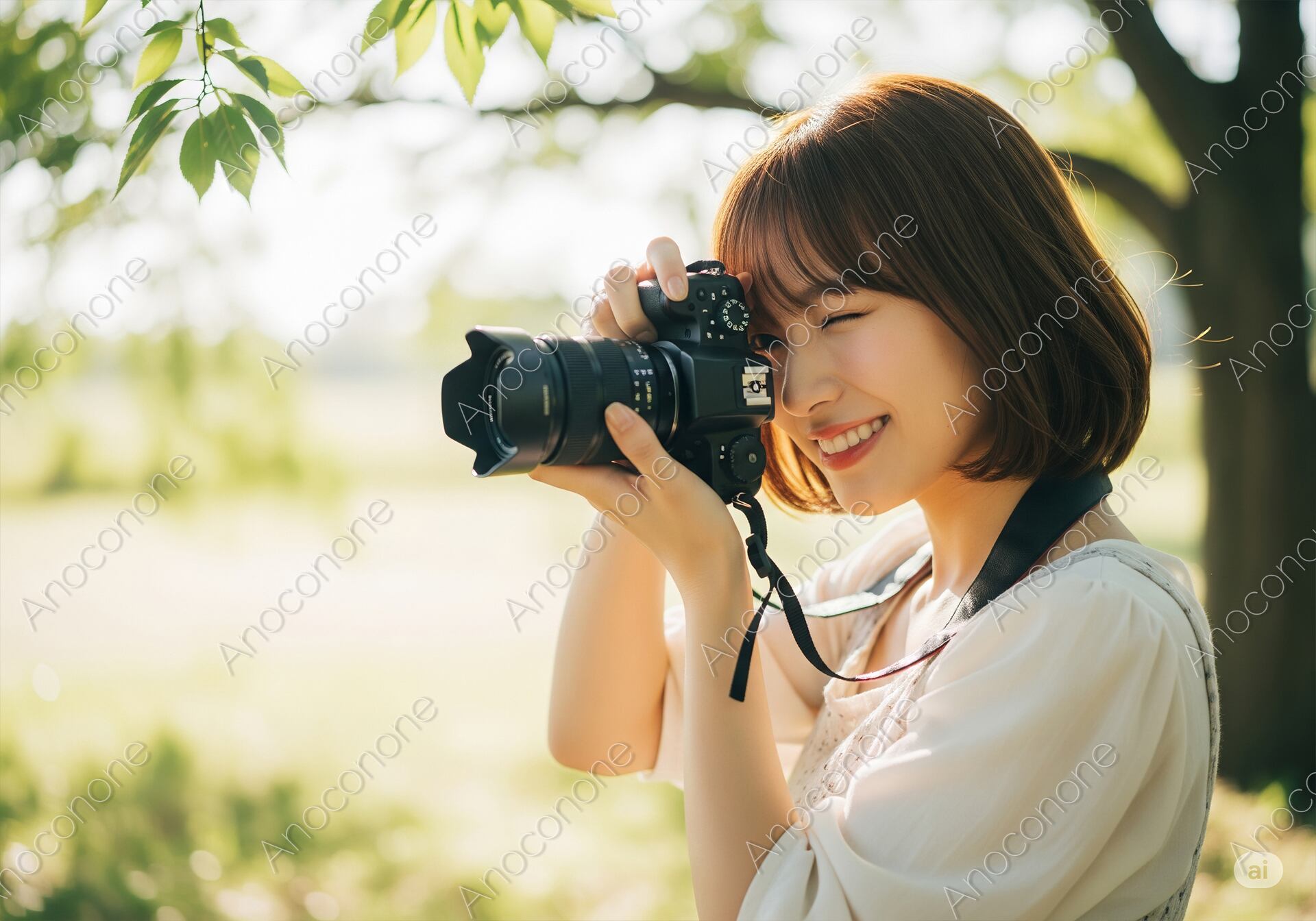 画像素材:明るい陽光が降り注ぐ新緑の公園で、一眼レフカメラを構えて楽しそうに微笑む女性を捉えたポートレートです。白いブラウスを身に纏った彼女は、片方の目を細めてファインダーを覗き込み、生き生きとした表情で撮影に没頭しています。背景には美しい緑の葉が広がり、柔らかい木漏れ日が彼女の横顔を優しく包み込んでいます。自然の光を活かした明るいトーンの描写は、清々しさと開放感を感じさせ、日常の何気ない瞬間をポジティブに切り取っています。手に馴染んだカメラやレンズの質感がリアルに表現されており、カメラを趣味とする人の充実した時間が伝わってくる構成です。全体的に透明感のある色調に整えられているため、見る人に清潔で爽やかな印象を与えます。カメラ女子のライフスタイルや、春から夏にかけてのアウトドア企画の素材として活用ください。