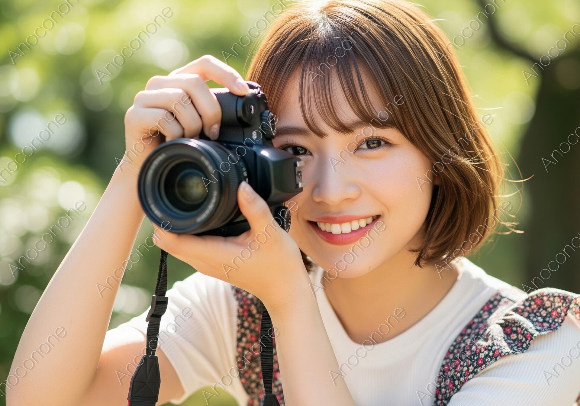 画像素材:木漏れ日が心地よく降り注ぐ公園で、一眼レフカメラを手に持ちながら晴れやかな笑顔を見せる女性を捉えたポートレートです。彼女は白いカットソーに落ち着いた色合いの花柄サロペットを合わせ、親しみやすく活動的な装いで休日を満喫しています。背景には生き生きとした緑が広がり、丸く柔らかなボケ味が主役である彼女の存在感を優しく引き立てています。レンズをしっかりと見つめる真っ直ぐな瞳と白い歯がこぼれる笑顔は、見る人に元気でポジティブな印象を与え、爽やかな空気感を作り出しています。カメラの細かな質感や彼女の髪の毛一本一本まで繊細に描写されており、静止画でありながらその場の楽しそうな会話が聞こえてくるような臨場感があります。屋外での趣味やライフスタイルをテーマにした広告、または親しみやすい人物素材を求めるメディアのアイキャッチに活用いただけます。