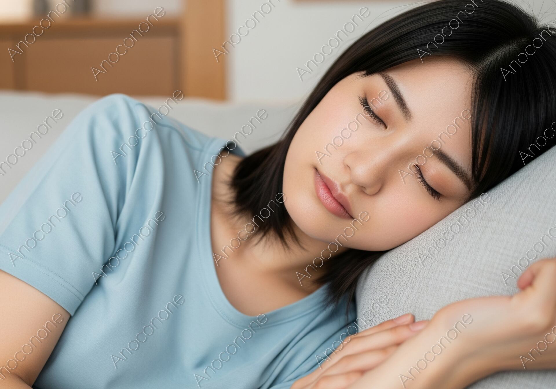 画像素材:清潔感のある明るいリビングルームで、ソファに身を預けて心地よく昼寝をする女性の姿を捉えた一枚です。柔らかな質感のクッションを枕にし、リラックスした表情で目を閉じる彼女の様子からは、日常の忙しさを忘れて休息を楽しむ穏やかな時間が伝わってきます。肌馴染みの良いブルーのTシャツとゆったりとしたパンツを着用しており、自然体で飾らないライフスタイルを象徴するような構成です。背景には温かみのある間接照明や観葉植物が配置され、整理整頓された室内が心地よい空間を演出しています。光の加減が非常にソフトで全体的に落ち着いたトーンにまとめられているため、見る人に深い安らぎと安心感を与えます。睡眠の質向上や自宅でのリラックスタイムをテーマにしたWebサイトのメインビジュアルをお探しの方に活用いただけます。