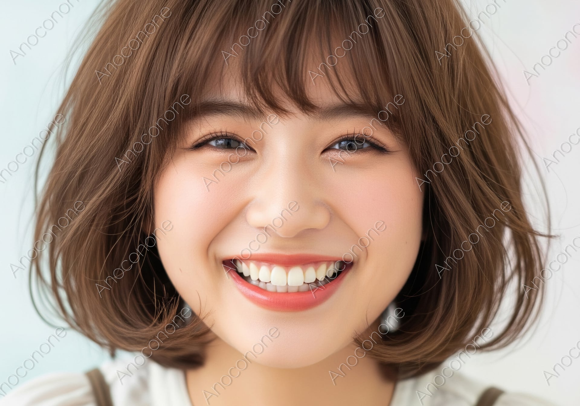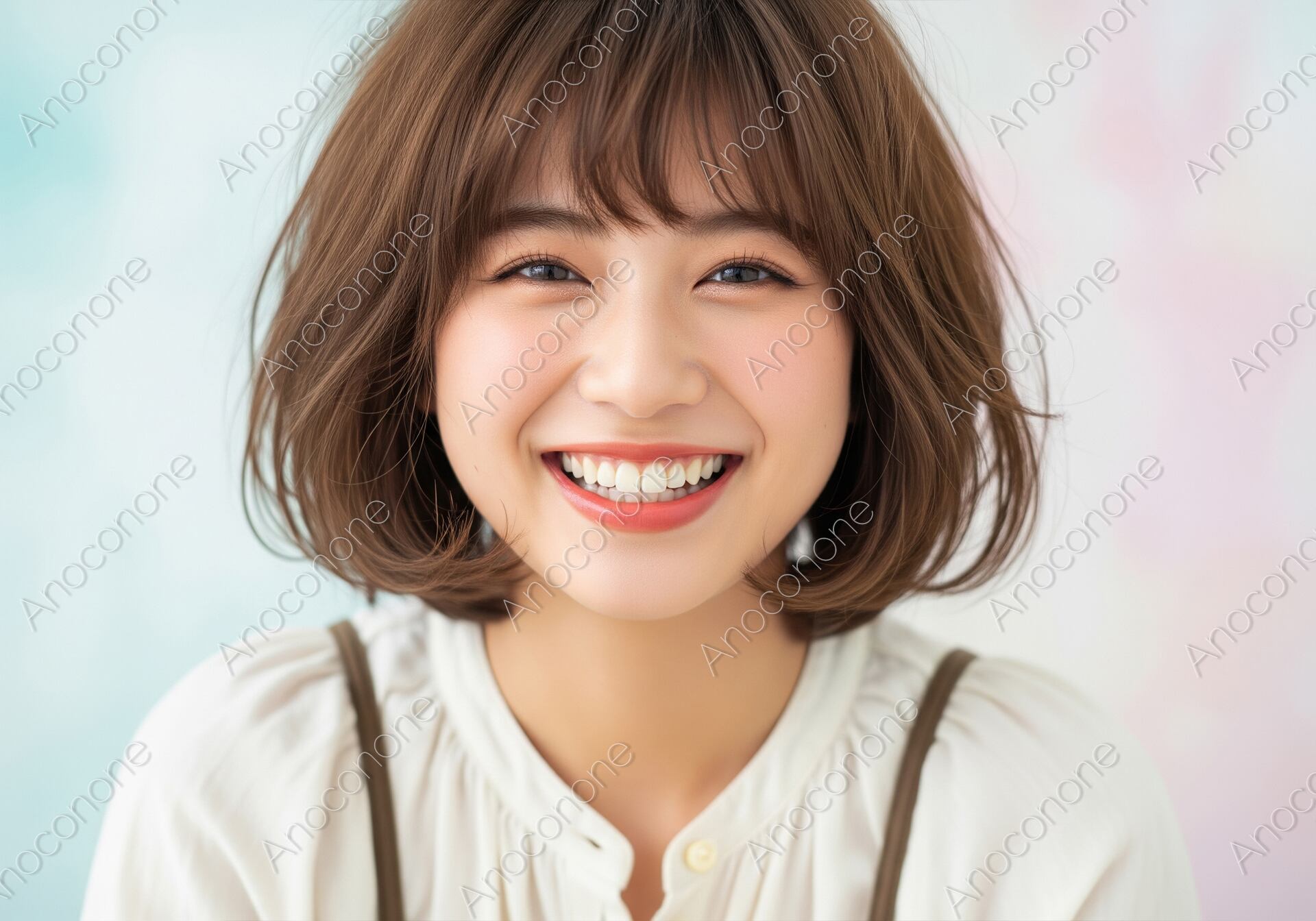 画像素材:柔らかい質感のボブヘアが印象的な女性が、画面いっぱいに明るい笑顔を届けてくれるポートレート素材です。彼女の生き生きとした瞳と整った白い歯がこぼれる笑みは、見る人に安心感とポジティブなエネルギーを与えます。清潔感のある白いブラウスを身に纏い、自然体で親しみやすい雰囲気を醸し出しています。背景は淡いパステルカラーが優しく溶け合うようにぼかされており、主役である彼女の表情をより一層際立たせています。光の当たり方が非常に穏やかで、肌の透明感や髪の細かな流れまで丁寧に描写されているのが特徴です。全体的に明るく開放的なトーンでまとめられているため、サイトの印象を華やかに彩ります。美容やヘルスケア、またはコミュニケーションを大切にするサービスの顔として、信頼感を高めるビジュアルに最適です。親しみやすい人物像を求めるメディアのアイキャッチに活用ください。