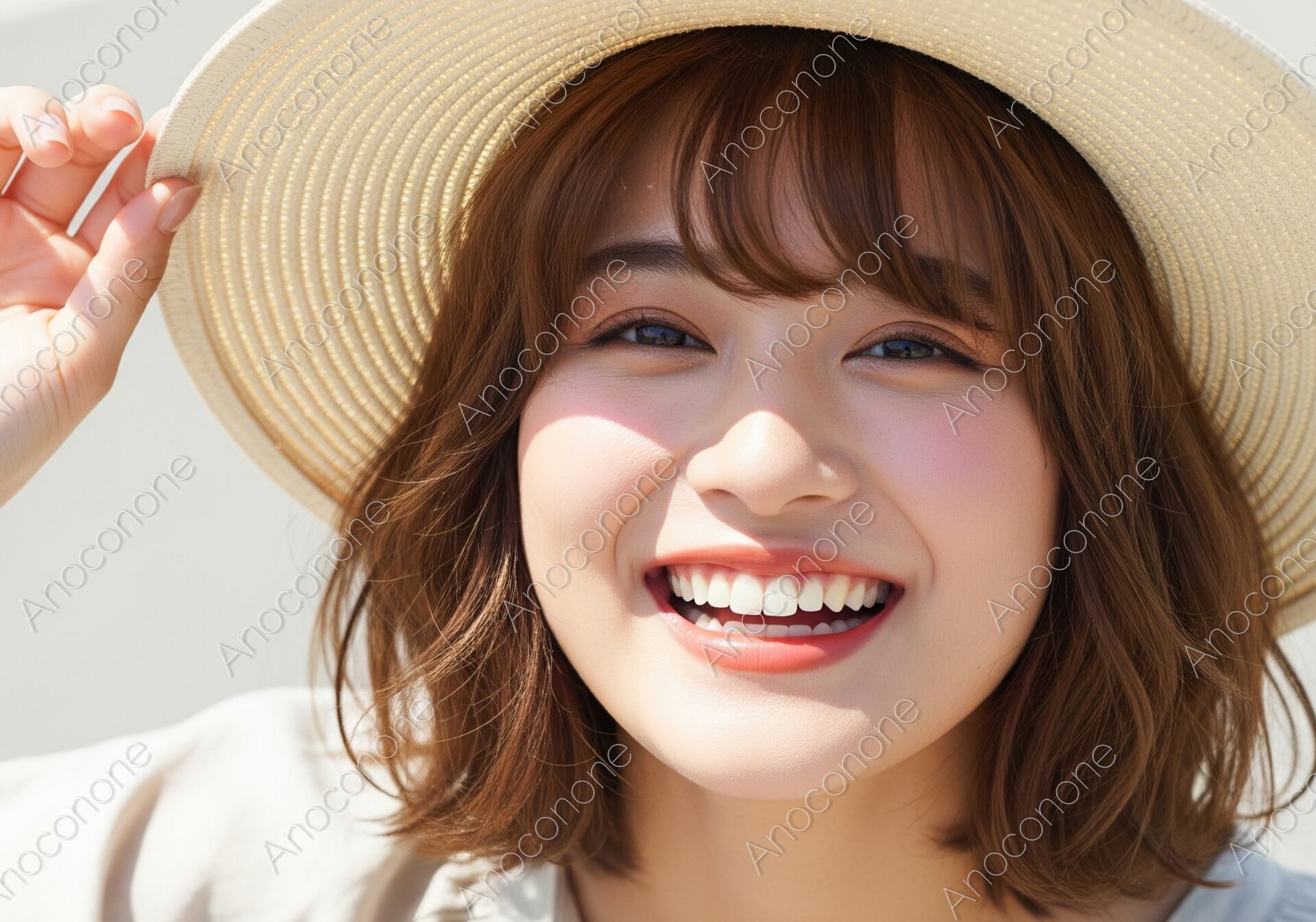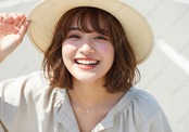 画像素材:抜けるような青空を連想させる明るい屋外で、ベージュの麦わら帽子を被り、心からの笑顔を浮かべる女性を捉えた至近距離のポートレートです。彼女のウェーブがかった柔らかなブラウンの髪が風に揺れ、日差しを浴びて健康的な輝きを放っています。細められた瞳と白く整った歯が覗く口元からは、夏の日の楽しさや開放感がストレートに伝わってきます。シンプルなライトグレーのトップスが彼女の明るい表情をより引き立て、全体的に透明感のある色調でまとめられています。背景を大胆にぼかすことで、彼女の生き生きとした瞬間の表情を鮮明に浮き上がらせており、見る人に親しみやすさと元気な印象を与える構成です。清涼感とポジティブなエネルギーに満ちたこの一枚は、夏のレジャーや旅行、また健康的な美しさをテーマにした広告のメインビジュアルに最適です。