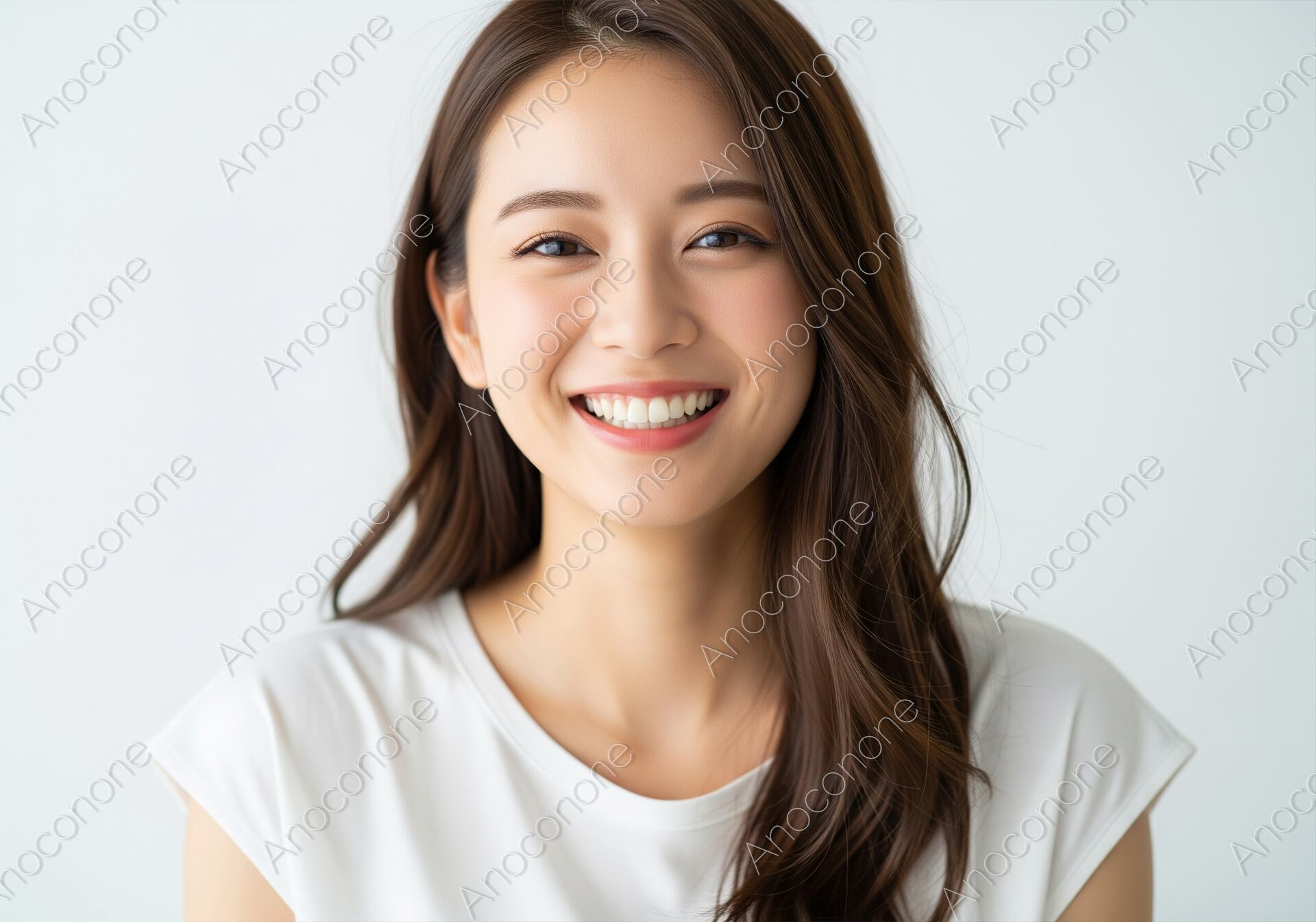 画像素材:白を基調とした清潔感のある空間で、真っ直ぐにカメラを見つめながら優しく微笑むロングヘアの女性を捉えたポートレートです。彼女の艶やかなブラウンの髪が肩に柔らかく流れ、シンプルな白いトップスが健康的で爽やかな印象を際立たせています。自然光をたっぷりと浴びた肌は透明感に溢れ、生き生きとした瞳と白く整った歯が覗く口元からは、心からの幸福感と充実したライフスタイルが伝わってきます。背景をシンプルに構成することで、彼女の真っ直ぐで親しみやすい表情がいっそう際立ち、見る人に深い安心感と信頼感を与える仕上がりです。光の加減がソフトで全体的に温かみのあるトーンでまとめられているため、静止画でありながらその場の穏やかな空気感まで伝わってくるようです。美容やヘルスケア、または親近感を大切にするサービスの顔として、信頼性を高めるビジュアルに活用いただけます。