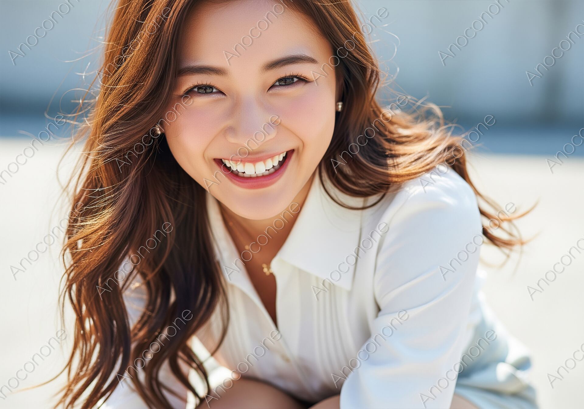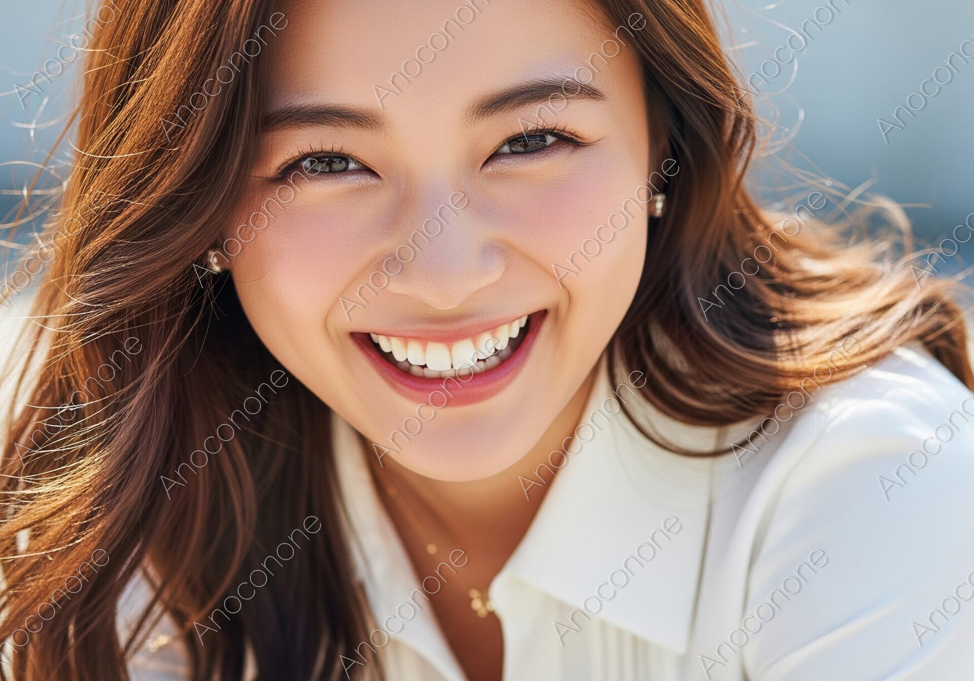 画像素材:抜けるような明るい屋外で、カメラに向かって晴れやかな笑顔を浮かべるロングヘアの女性を捉えたポートレートです。彼女の艶やかなブラウンの髪が肩に柔らかく流れ、白いブラウスが健康的で清潔感のある印象を際立たせています。自然光をたっぷりと浴びた肌は透明感に溢れ、生き生きとした瞳と白く整った歯が覗く口元からは、心からの幸福感と充実したライフスタイルが伝わってきます。背景をシンプルにぼかすことで、彼女の真っ直ぐで親しみやすい表情がいっそう際立ち、見る人に深い安心感と信頼感を与える構成です。光の加減がソフトで全体的に温かみのあるトーンでまとめられているため、静止画でありながらその場の穏やかな空気感まで伝わってくるようです。美容やヘルスケア、または親近感を大切にするサービスの顔として、信頼性を高めるビジュアルに活用いただけます。